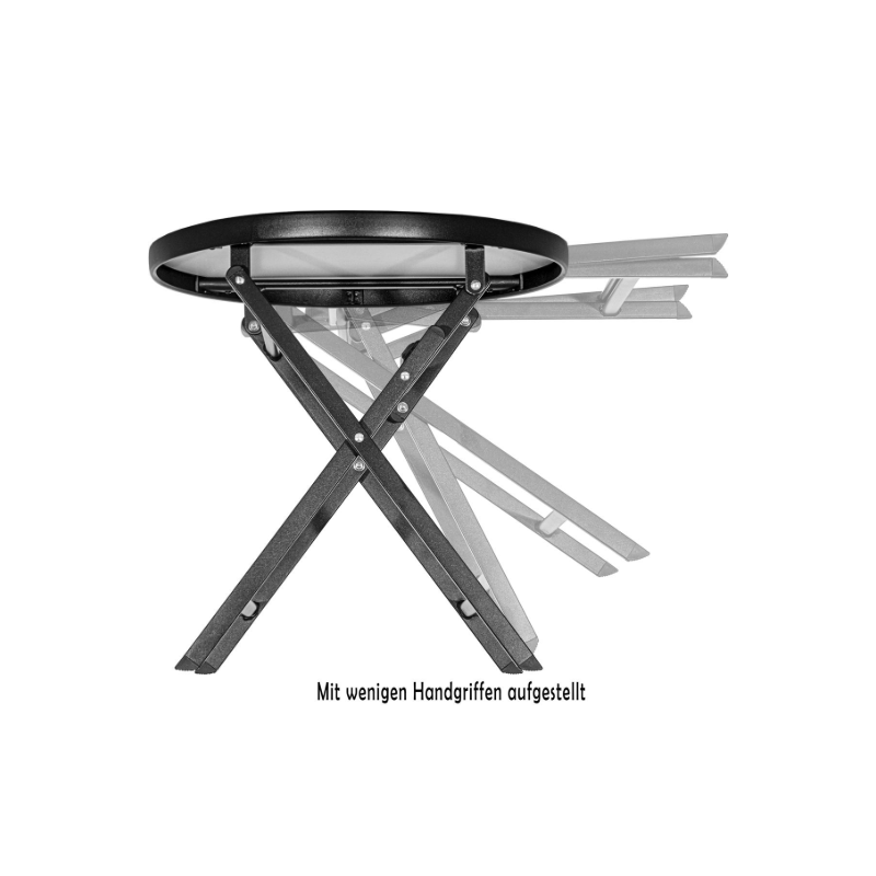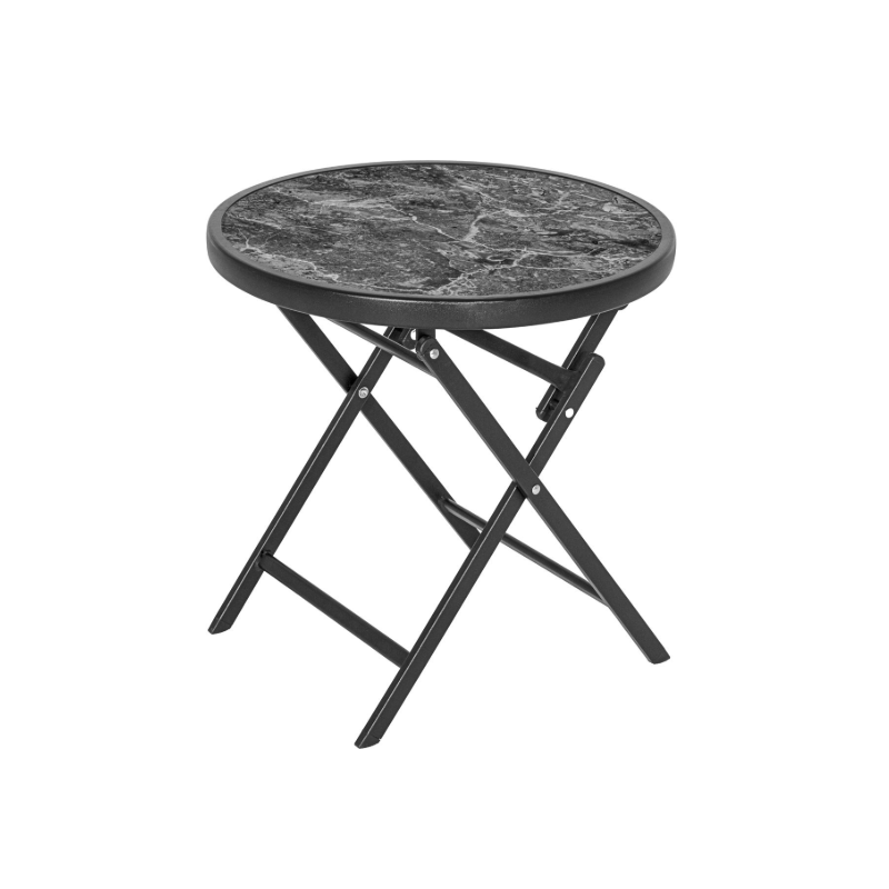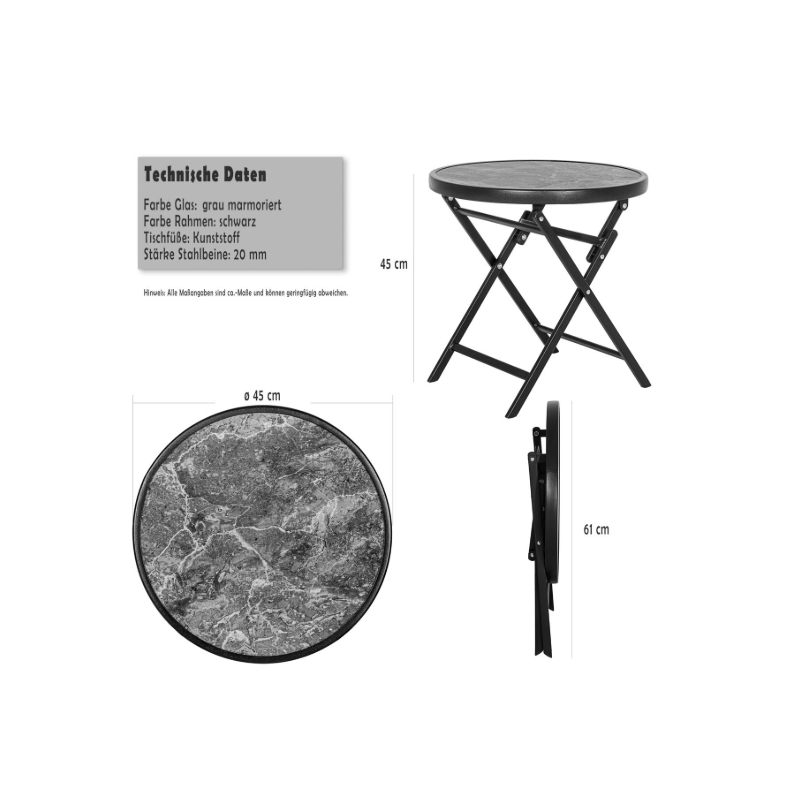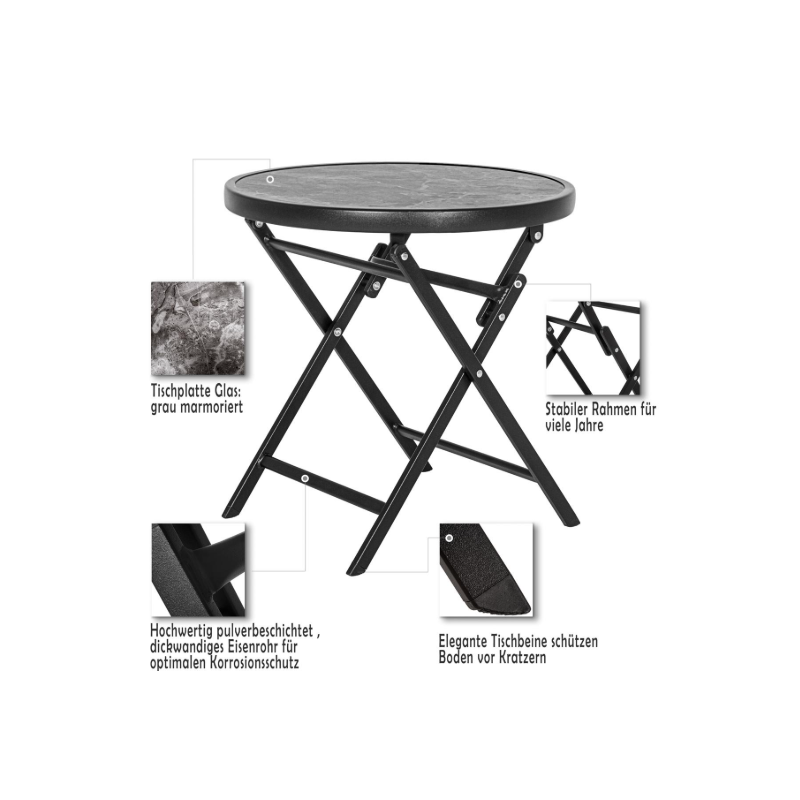 Tento praktický okrúhly stolík so sklenenou doskou a skladacou oceľovou konštrukciou je ideálny na podávanie nápojov a jedál v záhrade alebo zimnej záhrade, na balkóne alebo terase. Sklenený stolík je mimoriadne stabilný a ponúka priestrannú plochu. Sklopný rám poskytuje dodatočnú stabilitu a pevnosť. Tento stolík je odolný voči poveternostným vplyvom a ľahko sa čistí. Plocha stolíka s priemerom 45 cm ponúka priestor pre poháre, fľaše, taniere alebo časopisy. Výška stolíka je približne 45 cm. Tento vizuálne pôsobivý kovový stolík je ideálnym doplnkom vášho záhradného nábytku. Pozrite si aj naše ďalšie zaujímavé záhradné doplnky, ako sú skladacie stoličky, stohovateľné stoličky, záhradné stoly, slnečníky, súpravy a záhradné stoly.