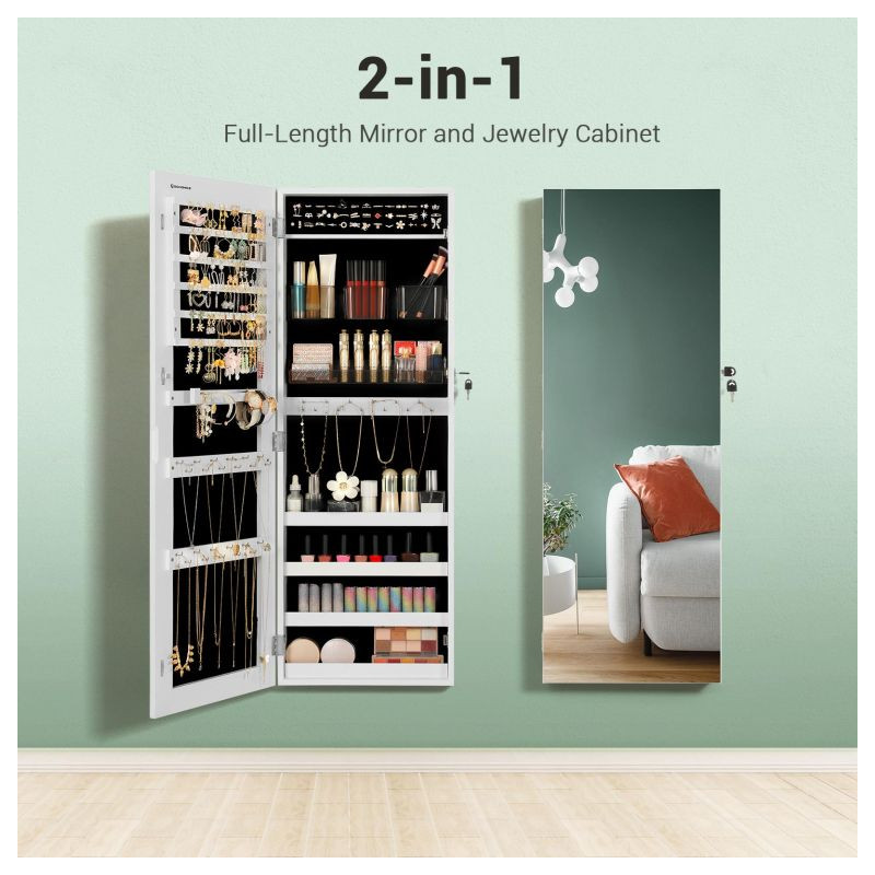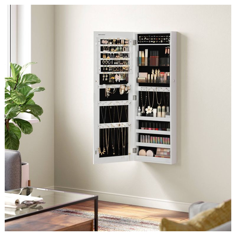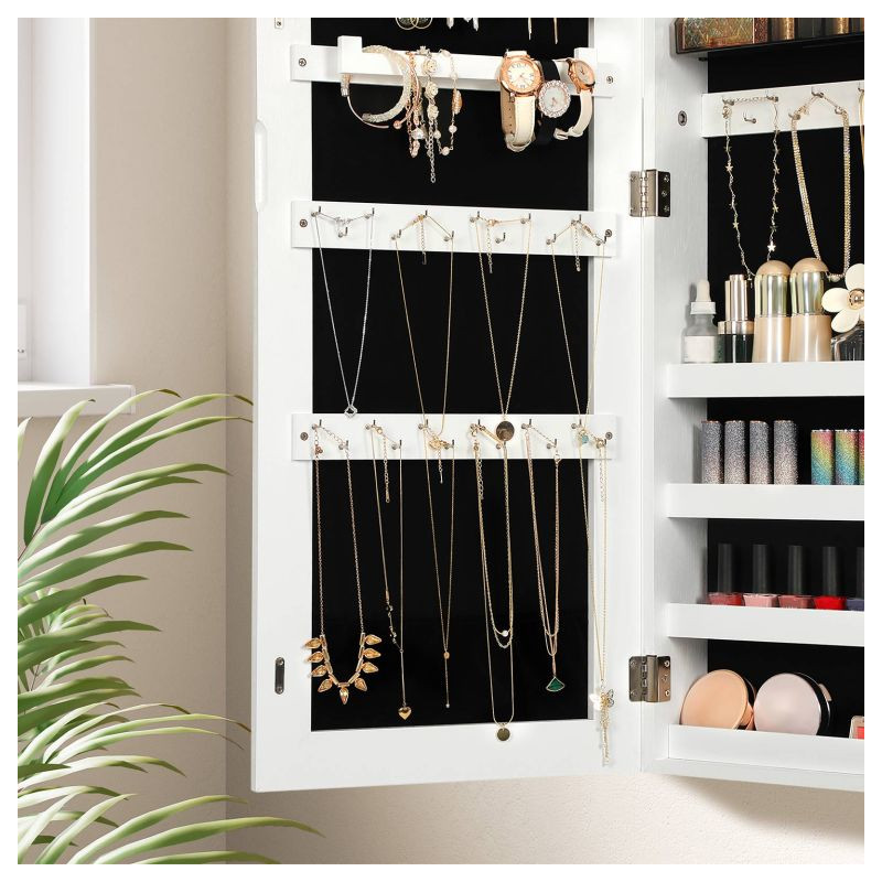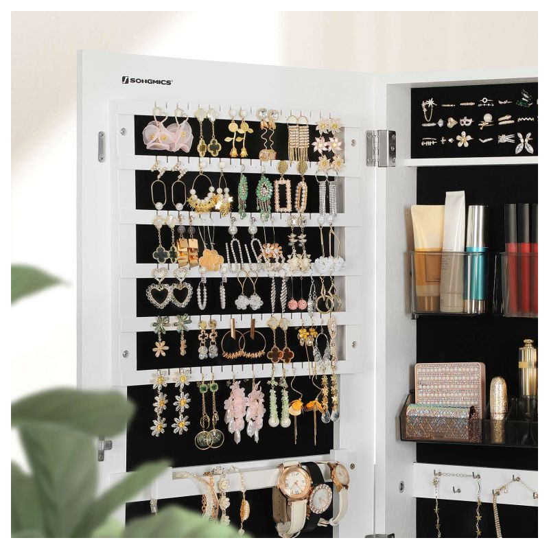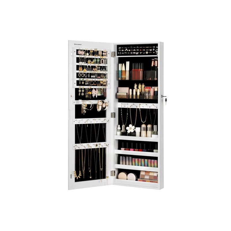 Robustná konštrukcia z MDF zaručuje dlhú životnosť, zatiaľ čo možnosť montáže na dvere alebo stenu šetrí miesto vo vašom interiéri. Vnútorné usporiadanie ponúka až 108 priehradiek na náušnice, 36 háčikov na náhrdelníky a 39 priehradiek na prstene. Dva odnímateľné organizéry na kozmetiku sa ľahko čistia. Inštalácia je jednoduchá a údržba nenáročná.