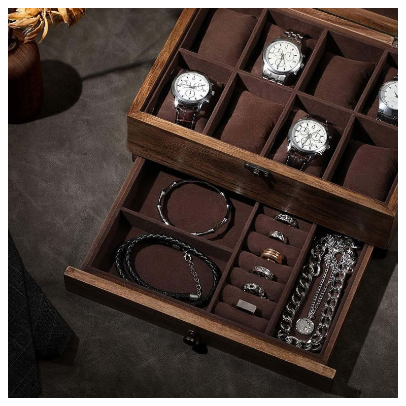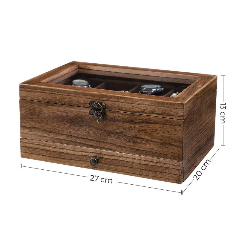 Uložte svoje hodinky a šperky štýlovo a prehľadne. Táto dvojposchodová škatuľka so skleneným vekom a mäkkým zamatovým vnútrom dodá vášmu domovu nádych luxusu. Ideálny darček pre každého, kto ocenia detaily a poriadok.