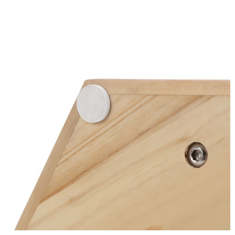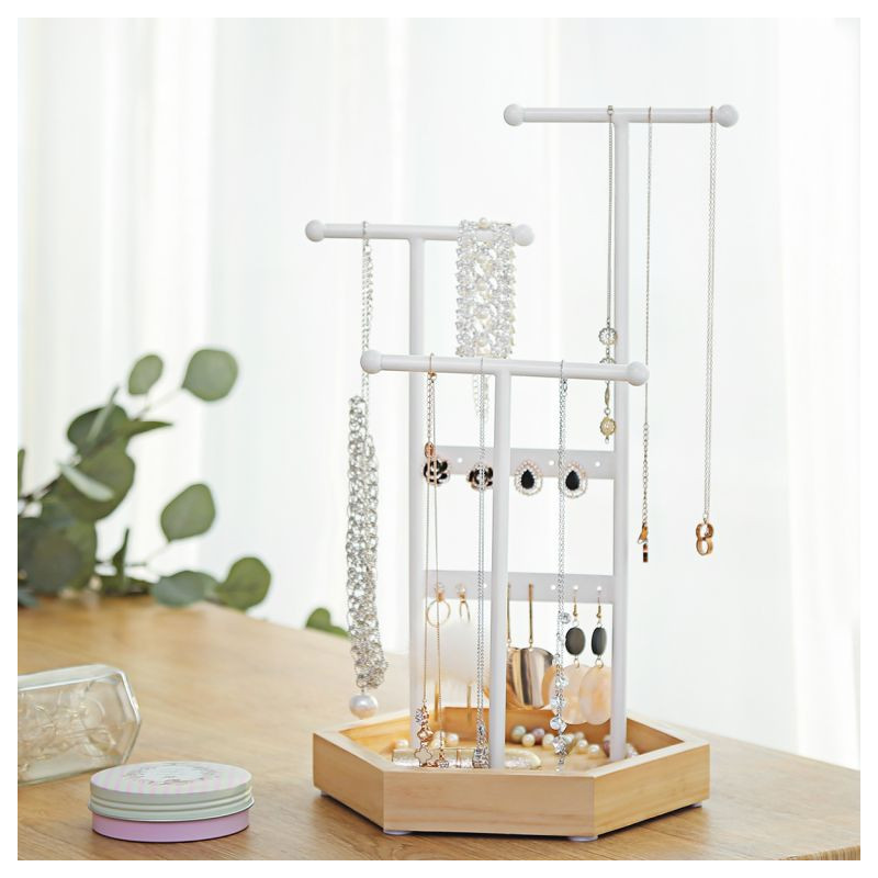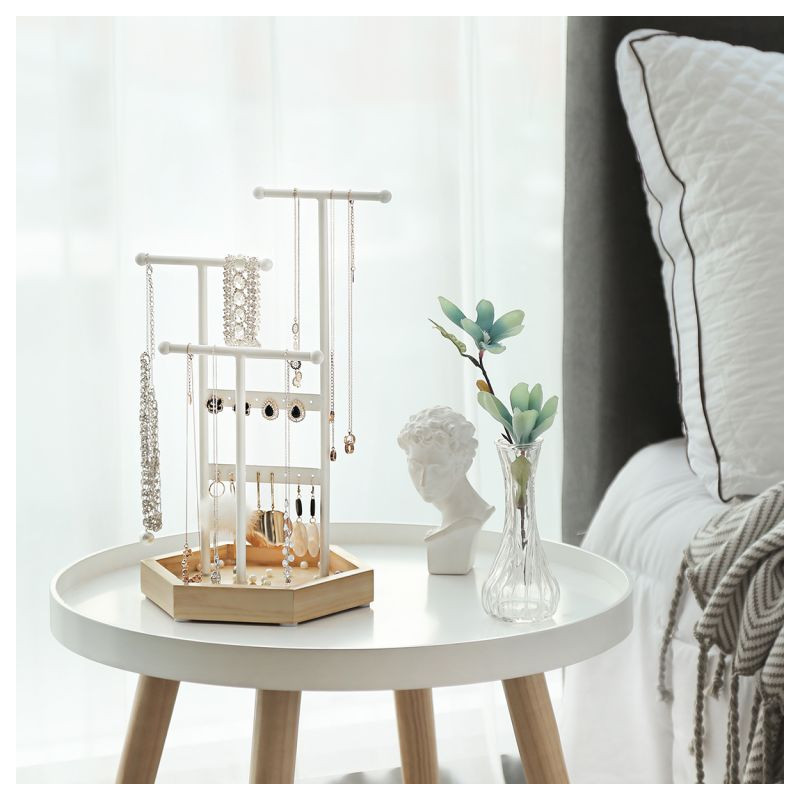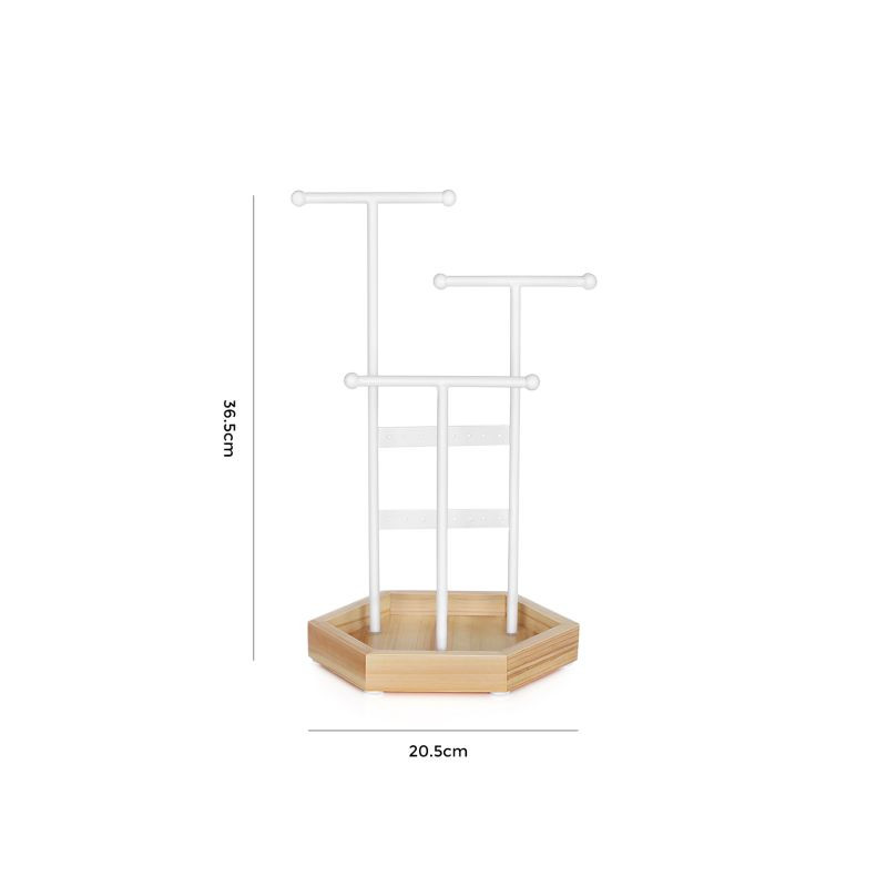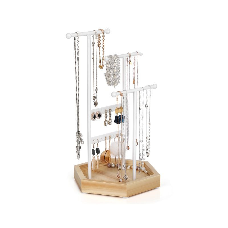 Hexagonálna drevená základňa zaisťuje stabilitu, zatiaľ čo tri T-tyče v rôznych výškach umožňujú zavesenie rôznych druhov šperkov. 16 otvorov poskytuje miesto pre náušnice a prstene. Jednoduchá montáž vďaka skrutkám a gumovým tesneniam.