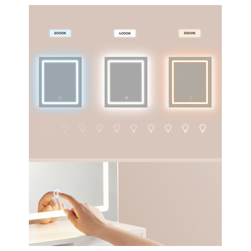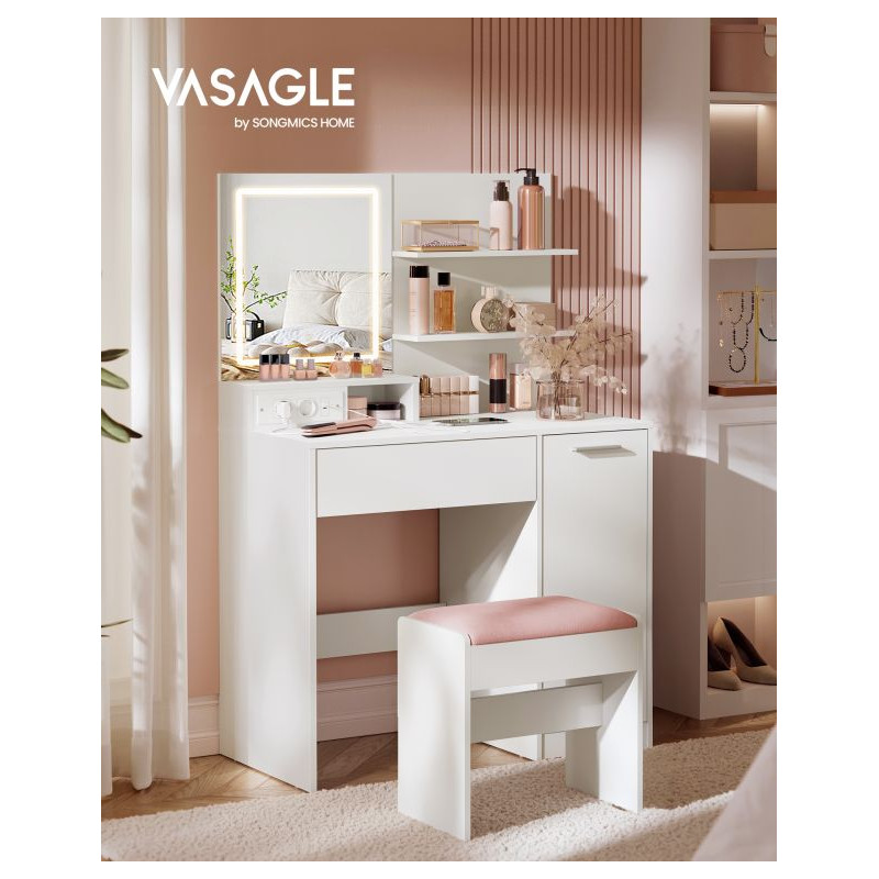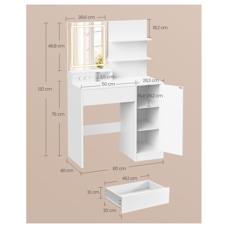 Stôl je vyrobený z odolnej MDF a drevotriesky, čo zaručuje stabilitu a jednoduchú údržbu. Praktické zásuvky, police a skrinka umožňujú prehľadné uskladnenie kozmetiky, zatiaľ čo napájací panel s USB portmi a zásuvkami uľahčuje každodenné používanie elektronických zariadení. Ochrana proti prevráteniu zaručuje bezpečnosť aj v domácnostiach s deťmi.