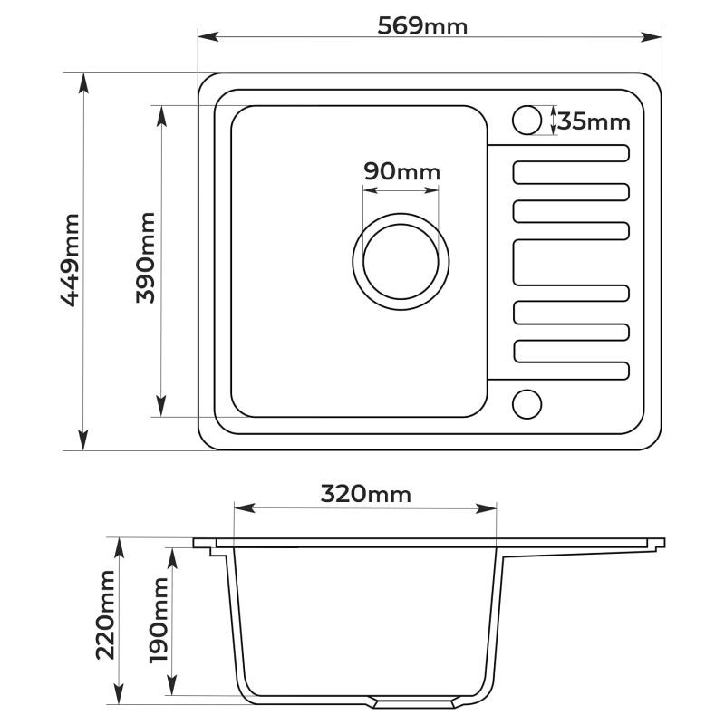 Náš granitový drez je možné namontovať pod alebo nad dosku a je možné ho tiež inštalovať obojstranne, takže odkvapkávač môže byť na ľavej alebo pravej strane. S celkovými rozmermi 56,9 x 22 x 44,9 cm sa náš drez skvele hodí ku kuchynskej skrinke s rozmermi: 62 x 50 cm. Tento obdĺžnikový vložený drez je vyrobený z 80 % z pravého kremenného kameňa a je odolný voči teplu, škvrnám, poškriabaniu a mechanickým a tepelným nárazom. Odolné voči teplotným šokom: + 15 °C / + 95 °C (1000 cyklov).