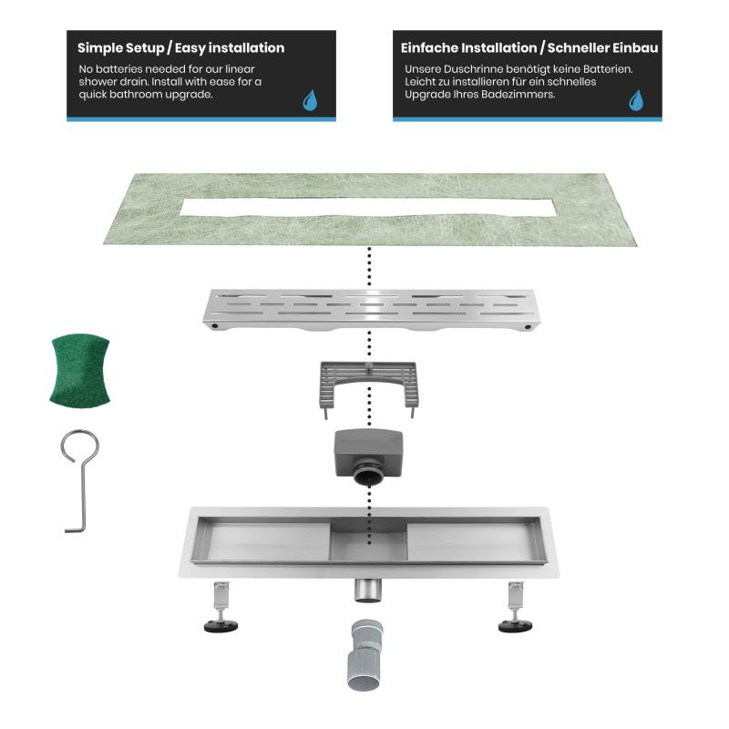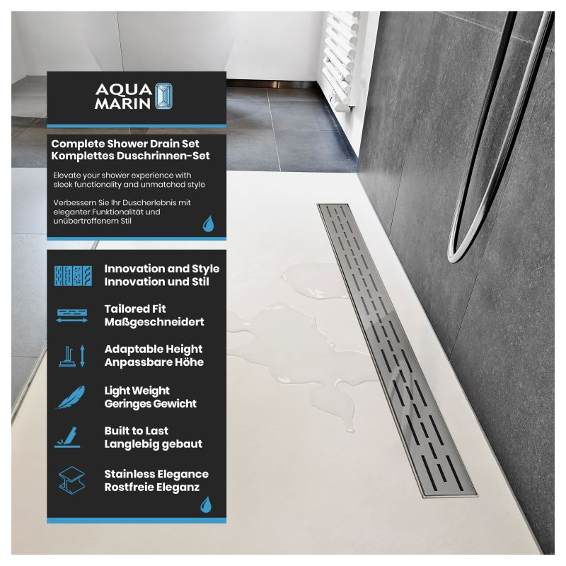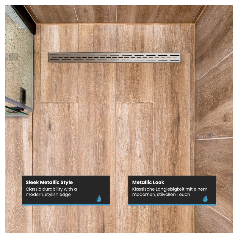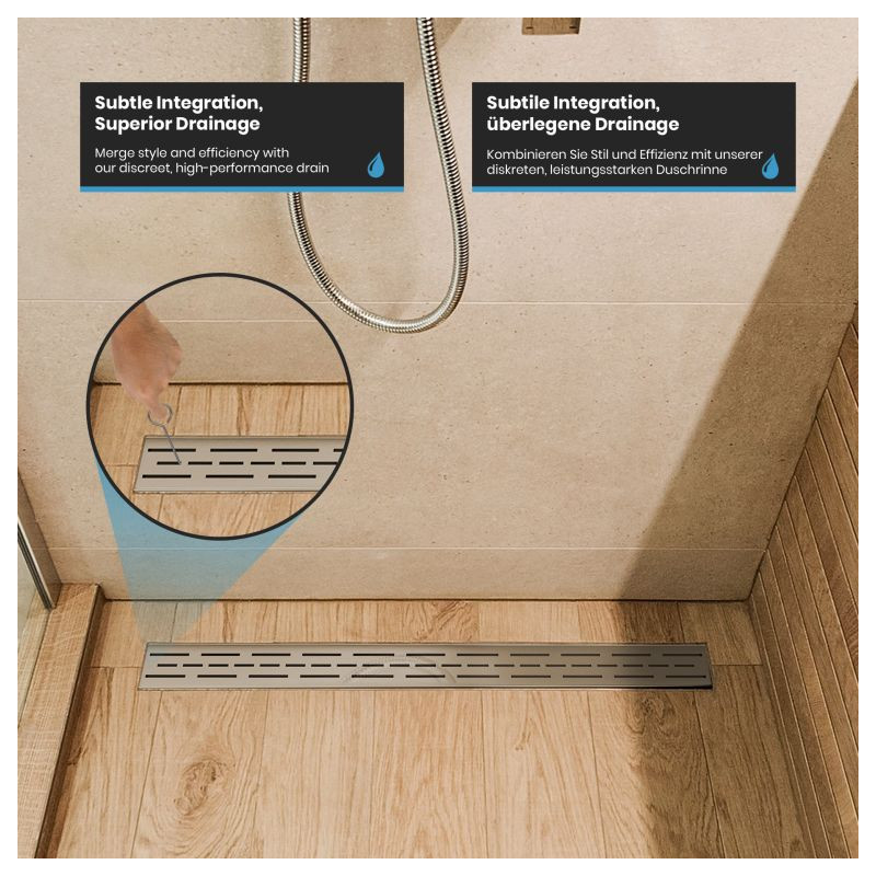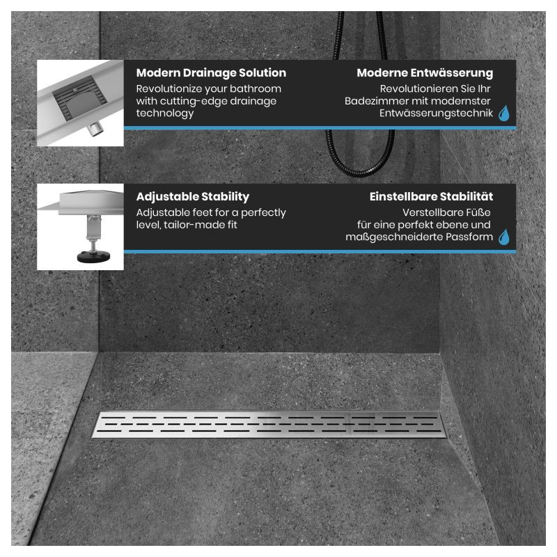 Premeňte svoju kúpeľňu na oázu štýlu a inovácií vďaka našim vynikajúcim lineárnym sprchovacím odtokom. Nerezová oceľ najvyššej kvality, umne kartáčovaná, v kombinácii s pieskovaným hlavným telom. Dizajn vašej kúpeľne si zaslúži niečo výnimočné, preto sú naše sprchové odtoky navrhnuté tak, aby nielen zaujali, ale aj inšpirovali svojou odolnosťou. Vďaka zapustenému povrchovému materiálu vám zaručujeme výrobok, ktorý obstojí v skúške času. Inštalácia je rýchla, nekomplikovaná a bez nutnosti použitia batérií. Mysleli sme na všetko, aby ste sa mohli bez obáv sústrediť na to podstatné. Vylepšite tvar a funkciu svojho sprchového kúta pomocou nášho elegantného a odolného lineárneho sprchového odtoku, ktorý dodá vašej každodennej rutine sofistikovanosť.