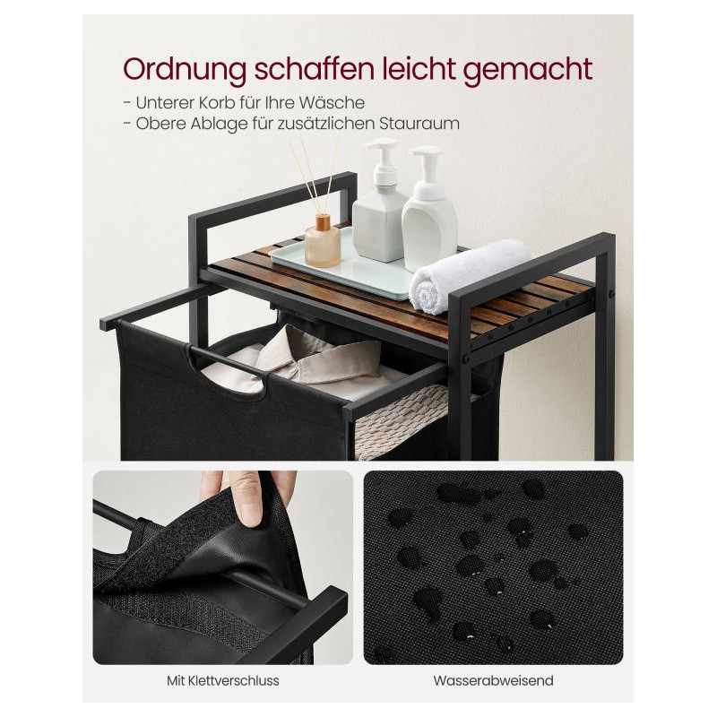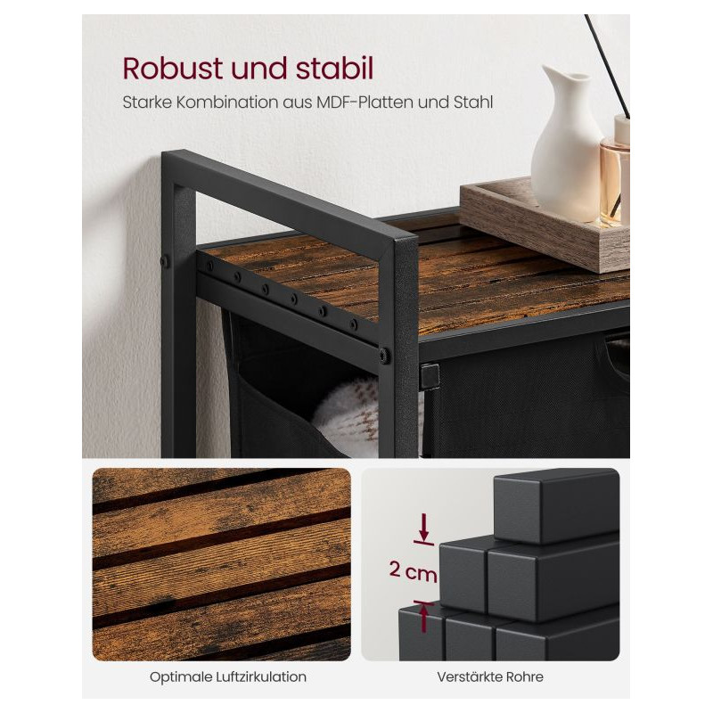 Rám z oceľových rúrok 2 cm a MDF zaisťujú stabilitu; polica unesie až 20 kg. Vložka z vodoodpudivého Oxfordu má plastové dno proti preveseniu. Vďaka suchému zipsu ju ľahko vysuniete a odnesiete k práčke. Nastaviteľné nôžky doladia stabilitu aj na nerovnej podlahe.