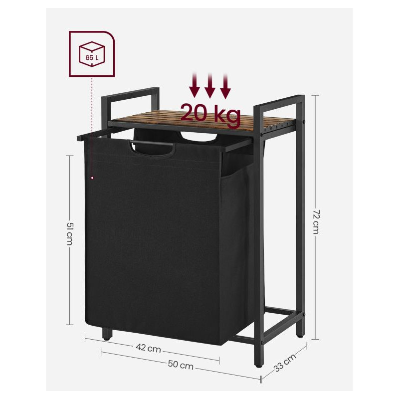 Úhľadné riešenie pre malé priestory. Kôš s objemom 65 l pojme týždennú várku bielizne pre jedného a vďaka kompaktným rozmerom zapadne do rohu kúpeľne, spálne aj práčovne. Horná vetraná lamelová polica udrží po ruke kozmetiku či pracie prostriedky a pomáha obmedziť zápach z bielizne.