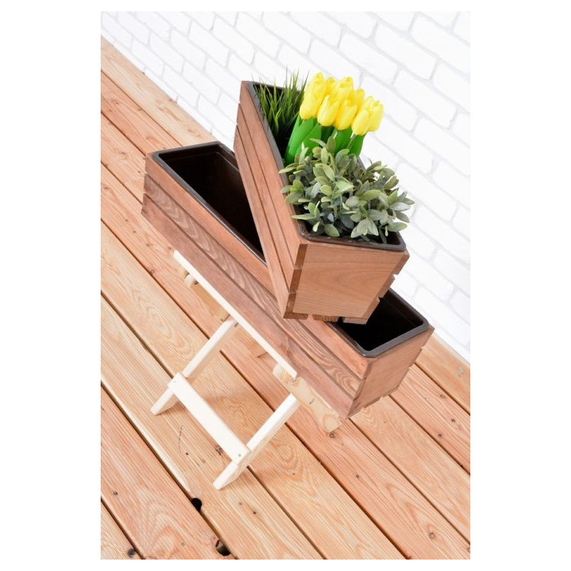 Truhlík je vyrobený z kvalitného borovicového dreva s povrchovou úpravou pre dlhšiu životnosť. Montáž ani údržba nie sú náročné a plastová vložka uľahčuje zalievanie aj čistenie. Produkt je certifikovaný FSC, čo zaručuje šetrný prístup k prírode.