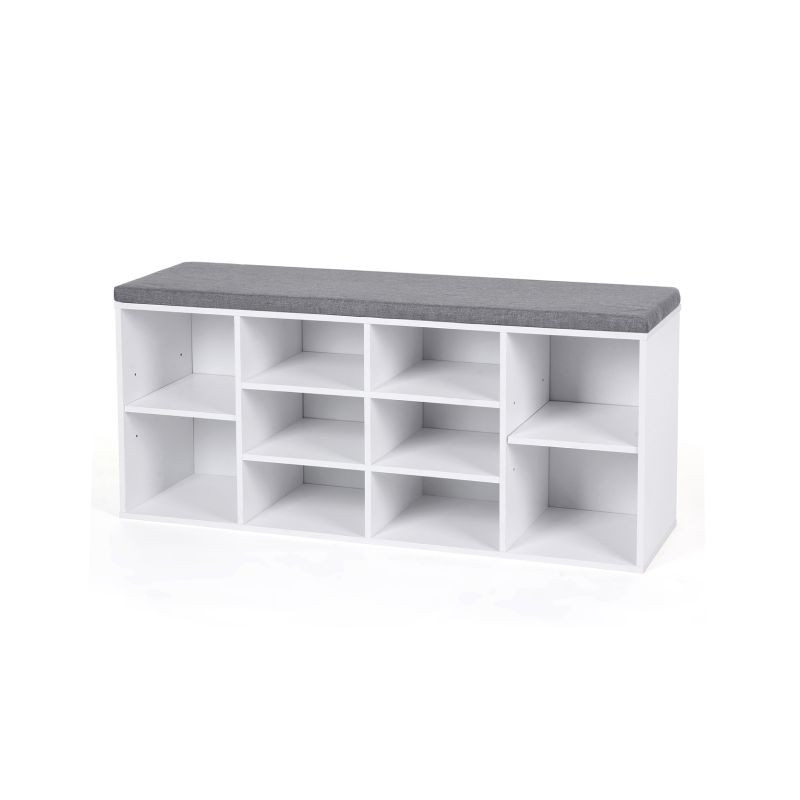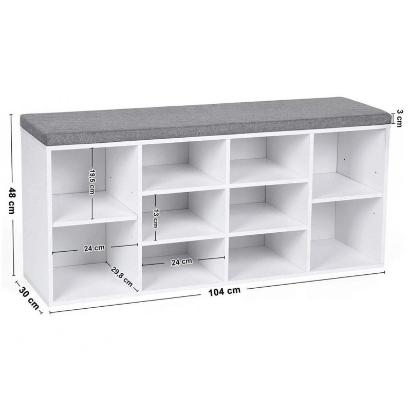 Botník ponúka 10 priestranných priehradok s hĺbkou 30 cm, vhodných pre topánky až do veľkosti 44. Nastaviteľné prepážky umožňujú ukladanie aj vyššej obuvi, napríklad členkových topánok. Stabilná konštrukcia unesie až 150 kg, takže sa naň môžete bez obáv posadiť.