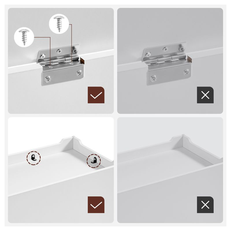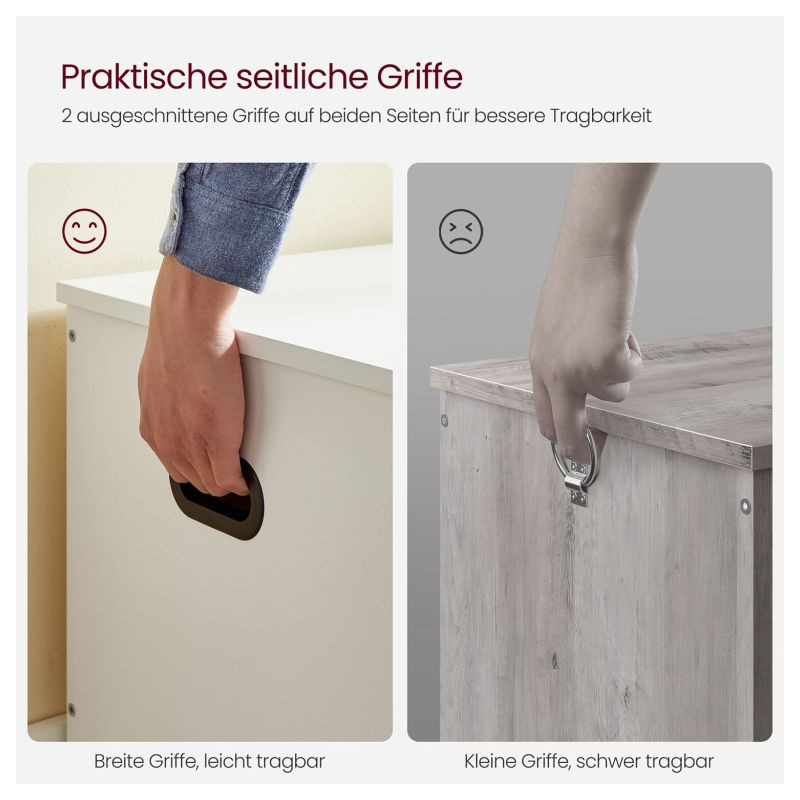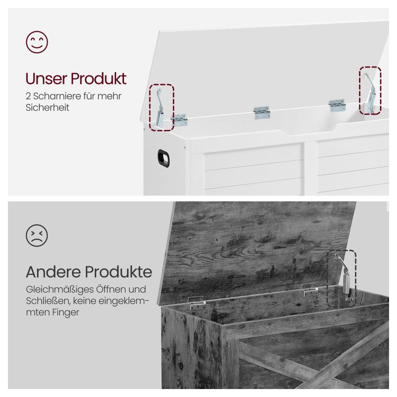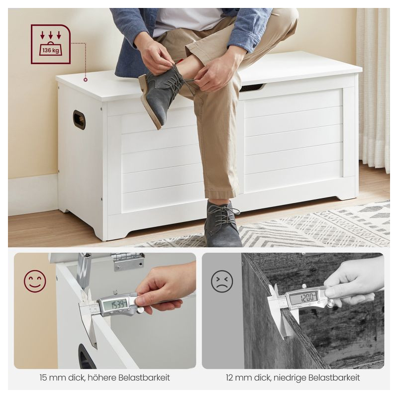 Lavica je navrhnutá tak, aby spájala estetiku a funkčnosť. Zosilnená konštrukcia unesie až 136 kg, takže sa môžete pohodlne posadiť pri obúvaní topánok. Bezpečnostné pánty zabraňujú privretiu prstov a bočné úchyty umožnia ľahké prenášanie. Vďaka šikovnému prevedeniu ide o spoľahlivý kus nábytku na každodenné použitie.