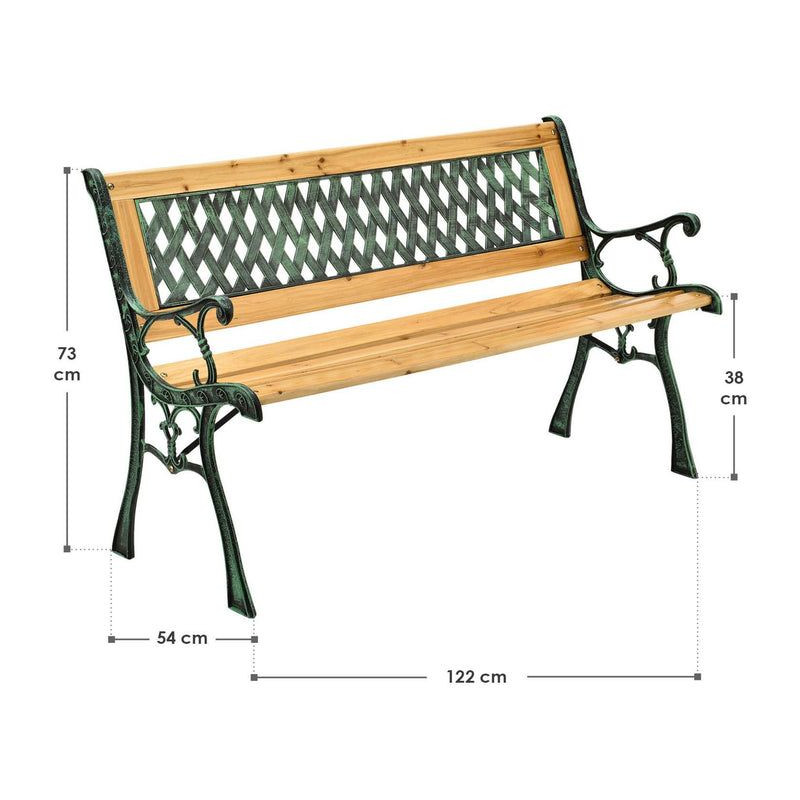 Robustná konštrukcia z lakovaného dreva a liatiny zaručuje dlhú životnosť a odolnosť voči poveternostným vplyvom. Lavica je navrhnutá tak, aby sa ľahko montovala a udržiavala, pričom pevné spojovacie prvky zabezpečujú stabilitu. Praktické podrúčky prispievajú k pohodliu sedenia.