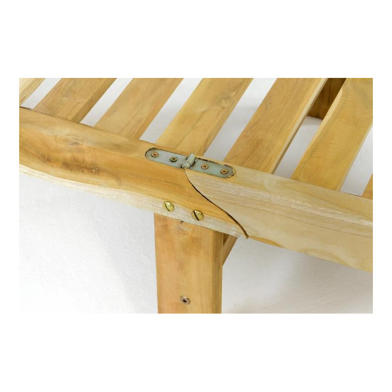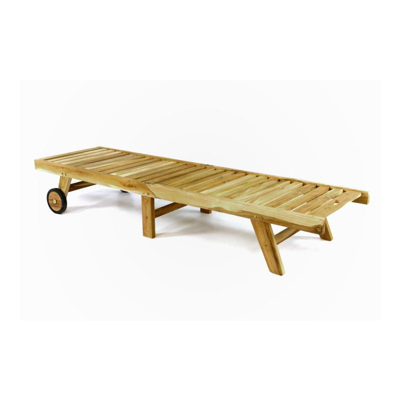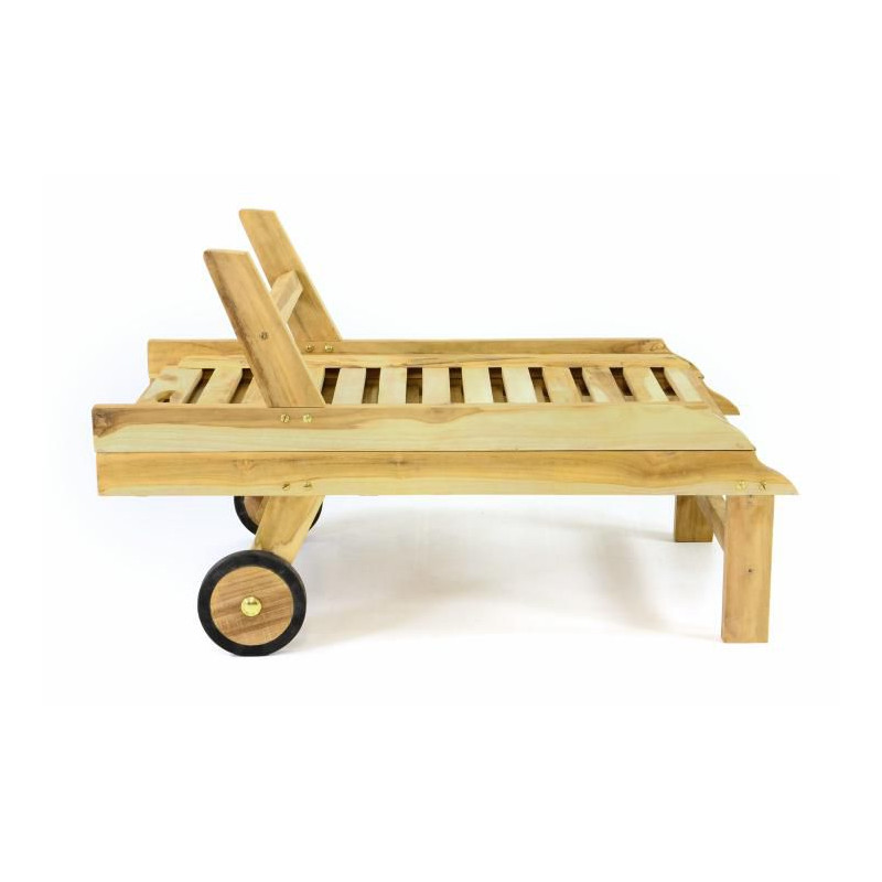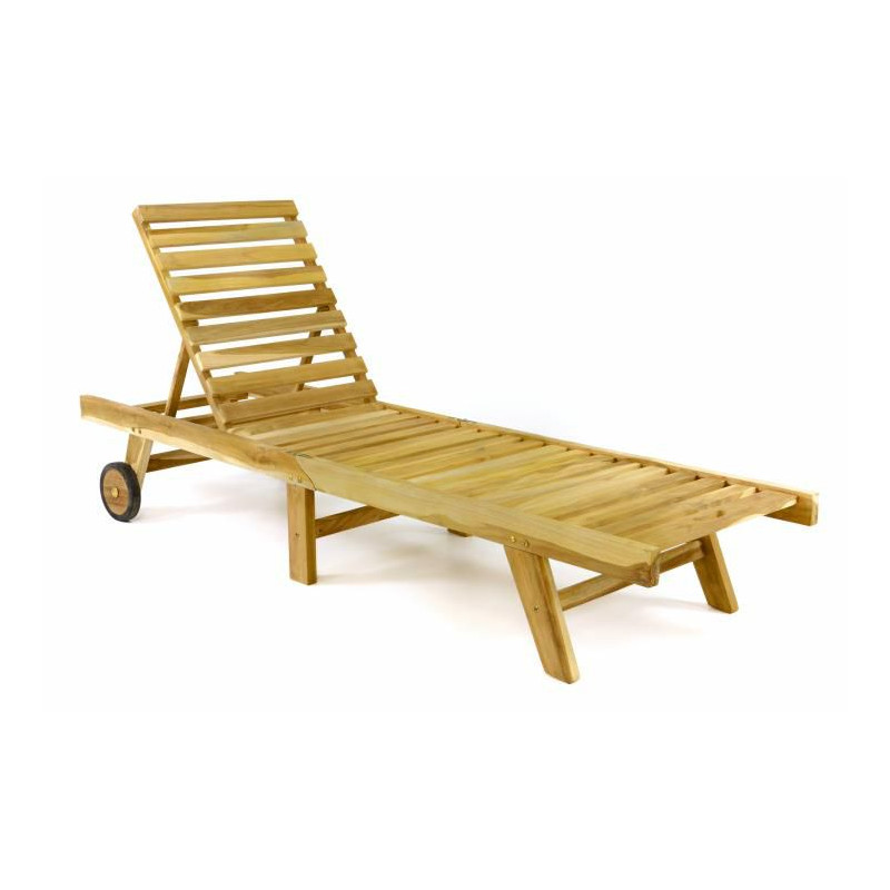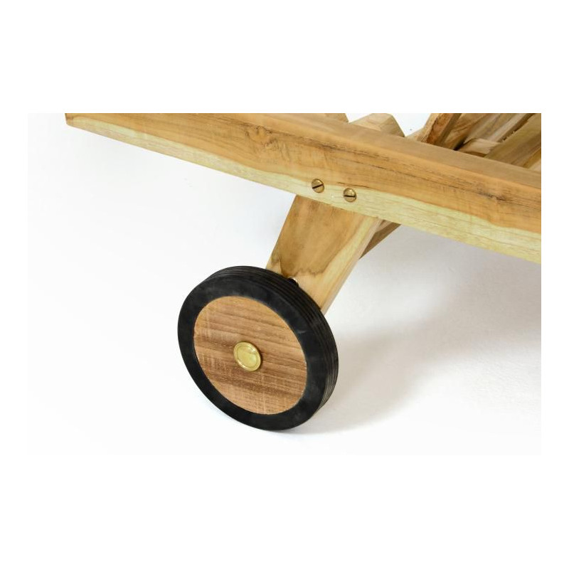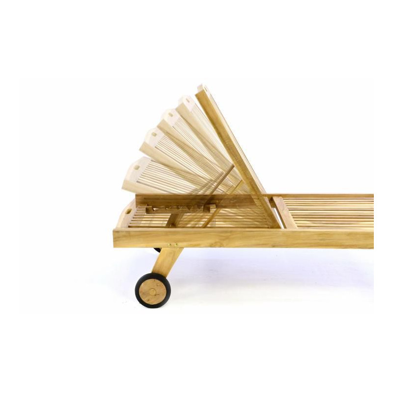 Kvalitné teakové ležadlo s kolieskami potiahnutými gumou a nastaviteľnou opierkou hlavy.