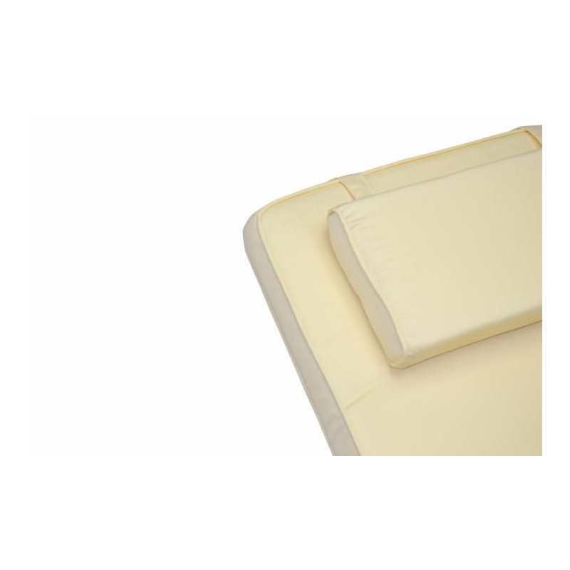 Elegantné ležadlo zo stabilného a počasiu odolného teakového dreva. Lehátko má odnímateľnú nožnú časť a polstrovanie v béžovej farbe.