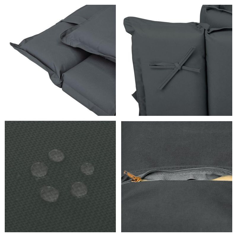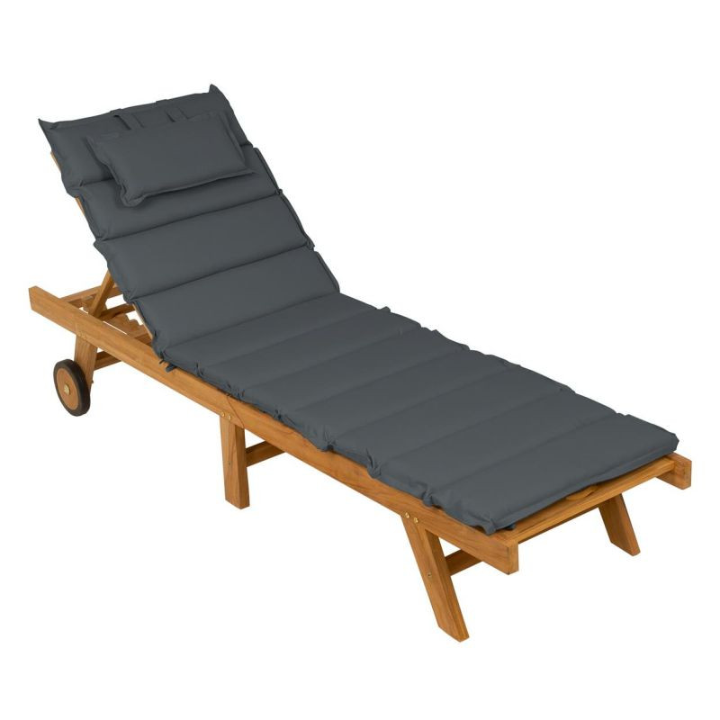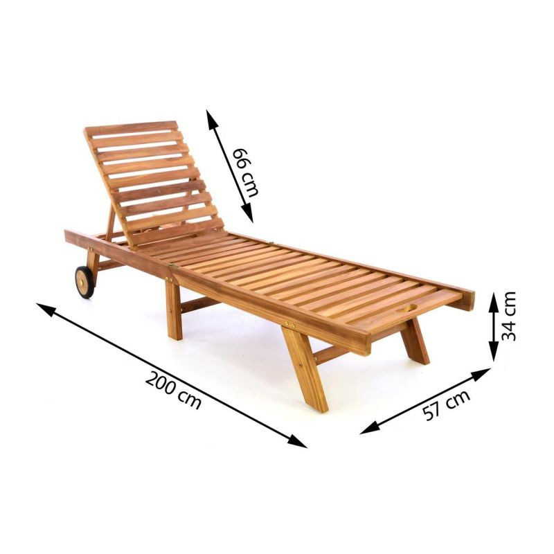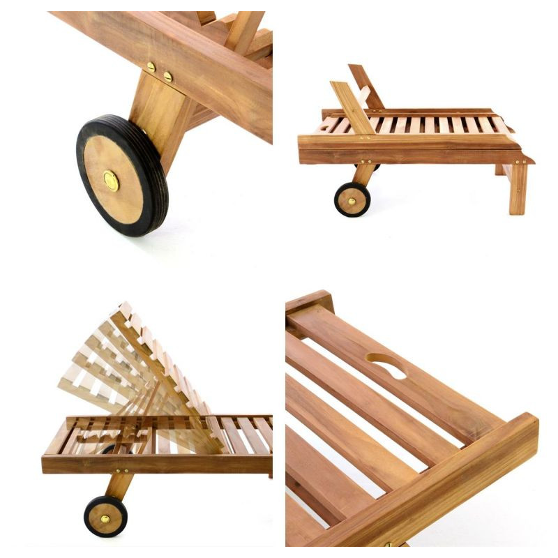 Ležadlo je vyrobené z upraveného teakového dreva s dvomi gumovými kolieskami. Vďaka päťstupňovému nastaviteľnému operadlu sa môžete rýchlo presunúť z polohy ľahu do polohy sedu. Sada obsahuje ľahko udržiavateľnú podložku zo štruktúrovaného polyesteru s 11 segmentmi a vankúšom pre pohodlný spánok. Poťah je stabilný, vodoodpudivý, umývateľný a odnímateľný pre jemné čistenie. Teakové drevo je veľmi odolné voči poveternostným vplyvom, a je preto ideálne pre vonkajšie použitie. Ležadlo je vyrábané ručne, preto je každý kus originálny.