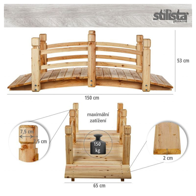 Drevený most je vďaka svojej pevnej konštrukcii mimoriadne stabilný a robustný a je možné ho zaťažiť až do hmotnosti približne 150 kg. Záhradný most je navyše orámovaný rustikálnym zábradlím. Vďaka predbežnému ošetreniu vhodným údržbovým olejom je most obzvlášť odolný voči poveternostným vplyvom a trvanlivý. Keďže sa jedná o prírodný produkt, šednutie a drobné praskliny sú normálnym procesom. Pravidelná starostlivosť môže predĺžiť životnosť mostíka.
