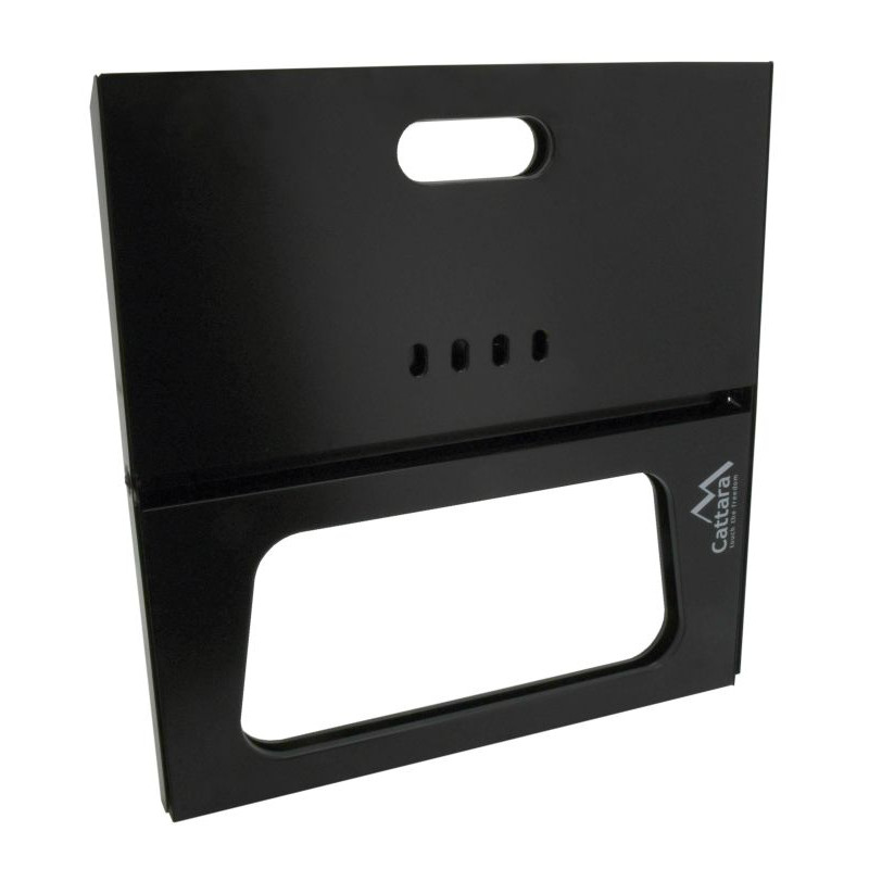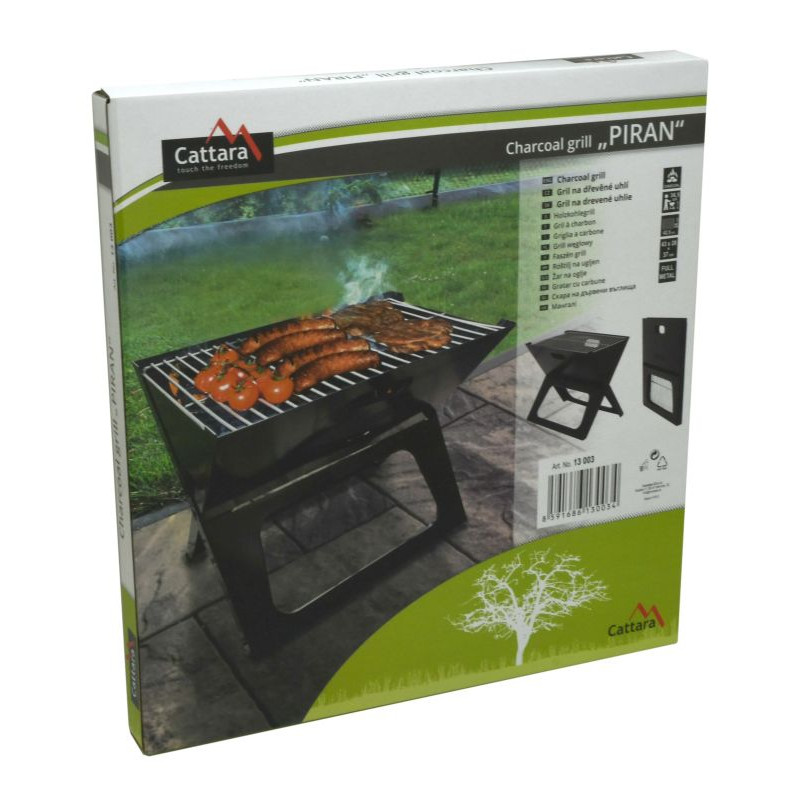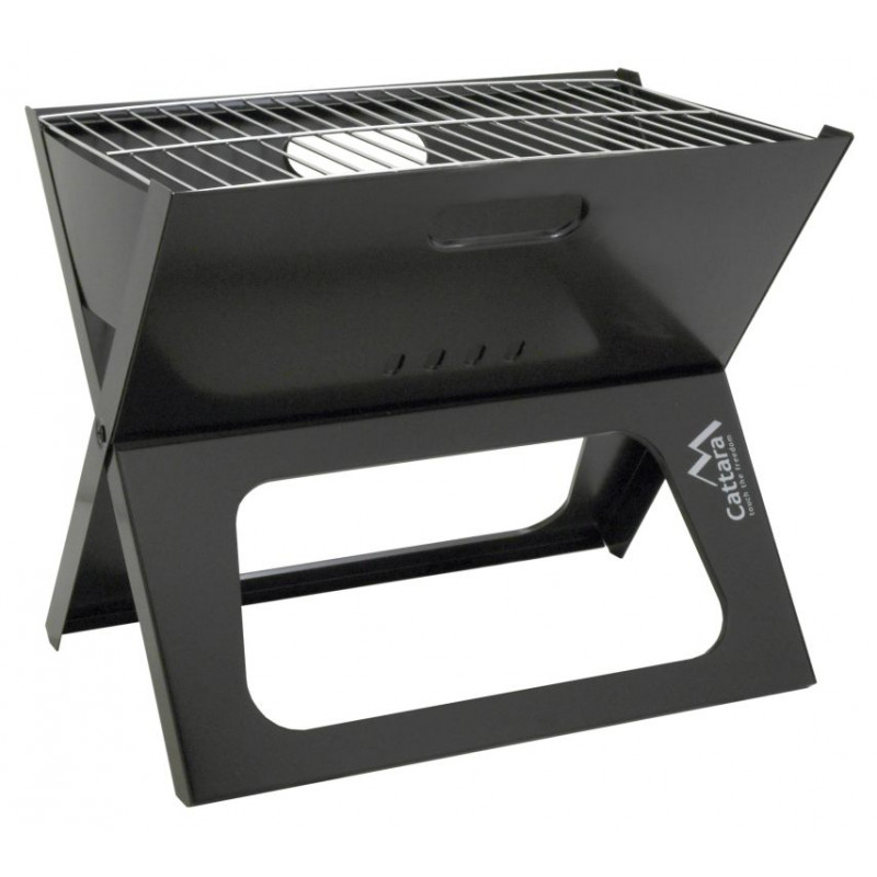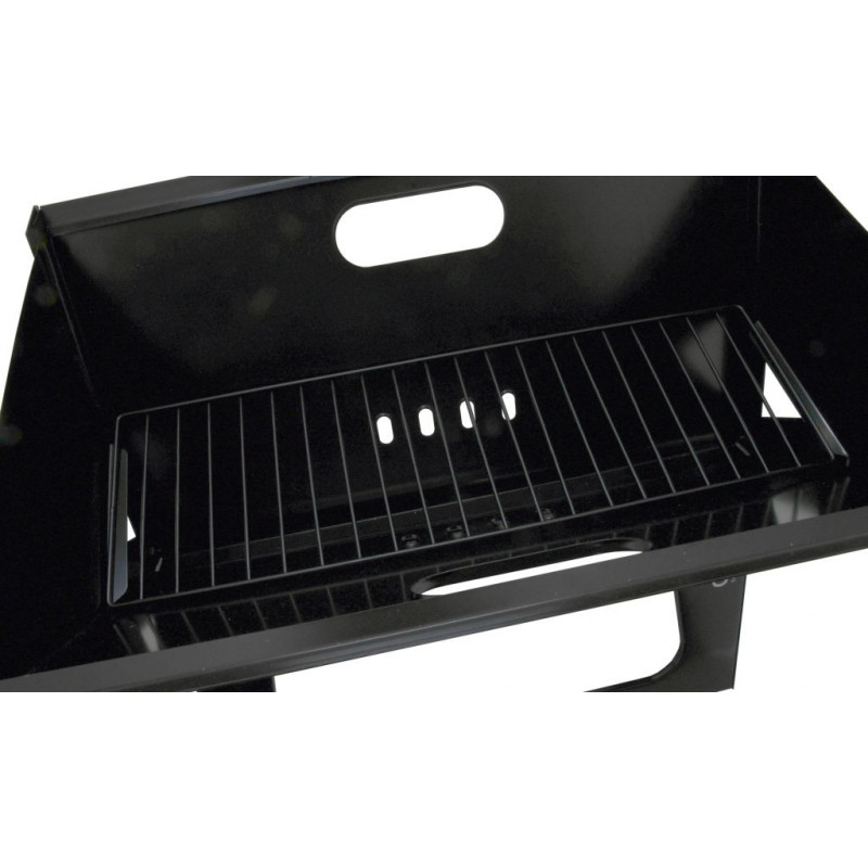 Konštrukcia je vyrobená z kvalitnej ocele s čiernym smaltovaným povrchom. Stabilitu zaisťuje krížová konštrukcia tela grilu. Rozmery grilu 43 x 28 x 37 cm. Na tepelnú prípravu pochutín je gril vybavený oceľovým roštom a plochou 42,5 x 26 cm vo výške 36,5 cm. Ventilácia na čelnej a zadnej strane konštrukcie zaistí plynulý prísun vzduchu. Pre ľahké prenášanie je možné gril jednoducho zložiť. Prepravné rozmery sú 46 x 44 x 3 cm.