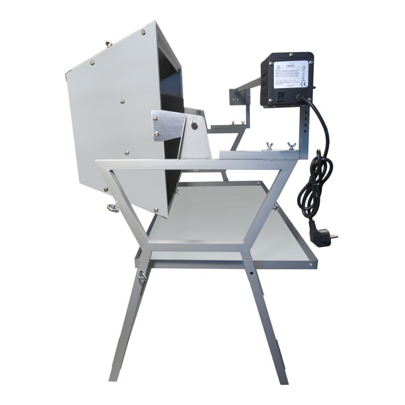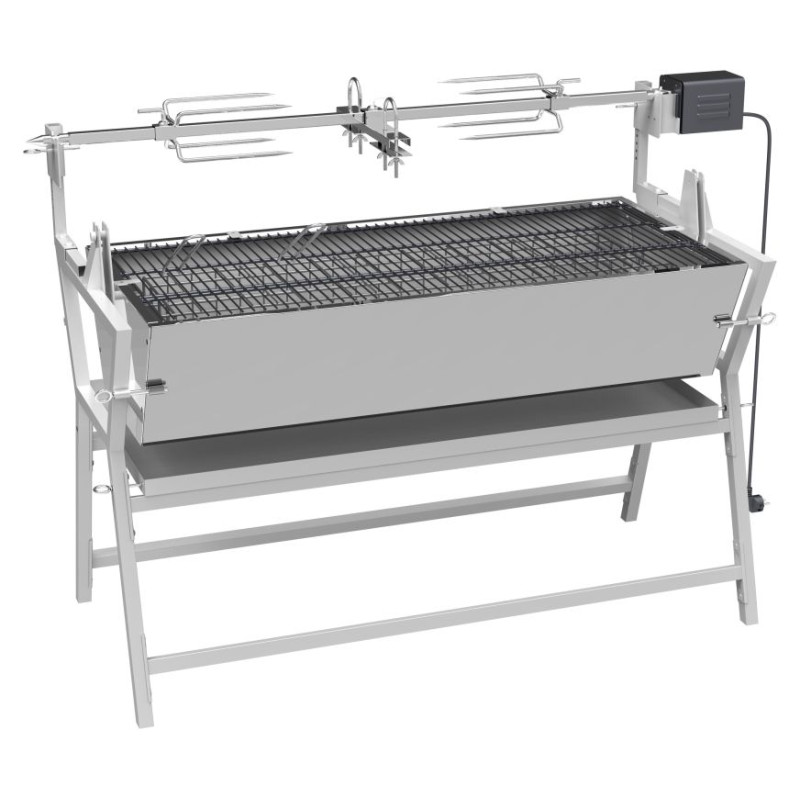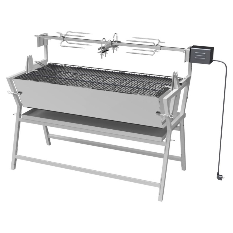 Konštruované z ocele, s povrchovou úpravou, s rozmermi 138 x 96 x 62 cm. Pre samotnú tepelnú prípravu Vašich pochutín je gril vybavený oceľovým roštom s rozmermi 102 x 46 cm. Konštrukcia zaisťuje vysokú stabilitu. Gril je možné použiť buď klasickým spôsobom, prípadne palivovú spodnú časť preklopiť na bok a využiť tak možnosť grilovania na ražni zo strany s tým, že odkvapkávajúcu mastnotu zachytí spodný plech. Plech na odkvapkávajúci tuk je možné použiť aj na zakrytie palivovej časti. Gril je doplnený výkonným motorom s napájaním na 230V pre otáčanie pokrmov pri rýchlosti 3ot./min. Na vidlice - motor je možné naložiť až 30 kg pokrmov. Gril je vhodný najmä na grilovanie prasiatka, niekoľkých kusov kurčiat, veľkého množstva mäsitých, ale aj ďalších pokrmov.