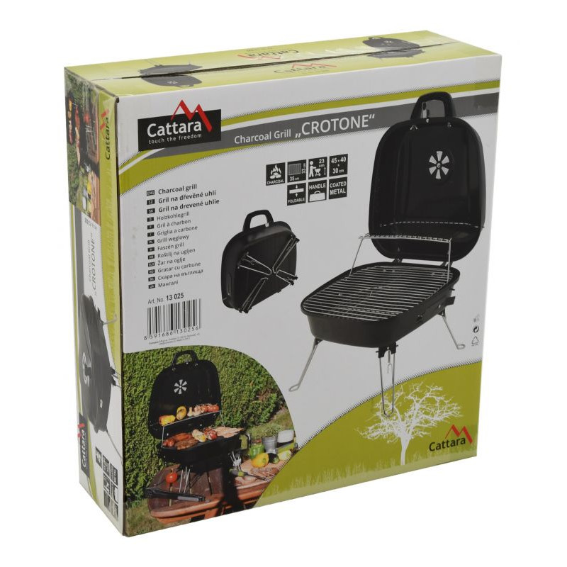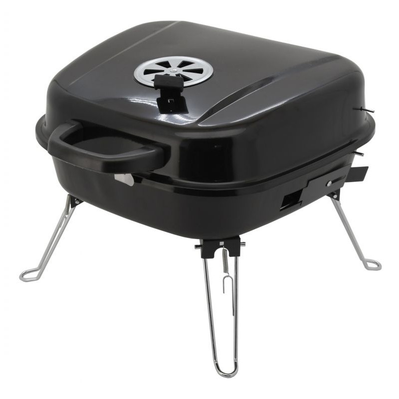 Konštrukcia je vyrobená z kvalitného smaltovaného oceľového plechu čiernej farby. Stabilitu zaisťujú štyri kovové rozkladacie nohy. Na tepelnú prípravu pochutín je gril vybavený oceľovým roštom 35 x 33 cm. Gril je vybavený regulovateľnou ventiláciou na veku. Grilovací priestor je navyše vybavený odkladacím roštom. Pre ľahké prenášanie je zložený gril zaistený páčkou a pomocou rukoväte je možné ľahko prenášať.
