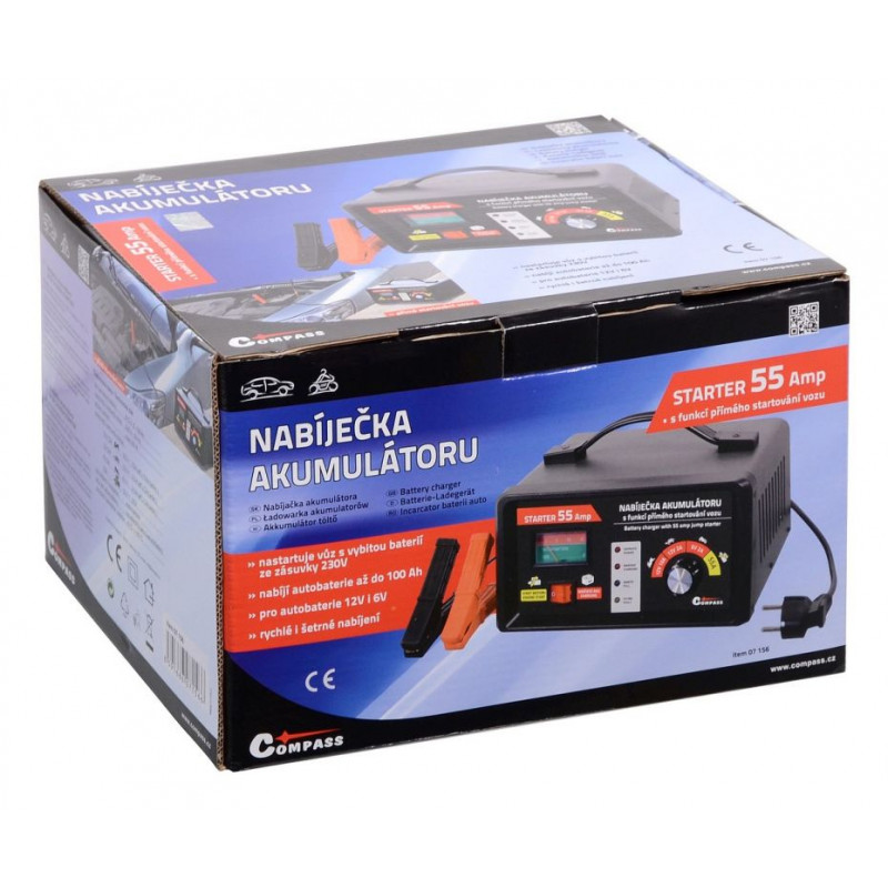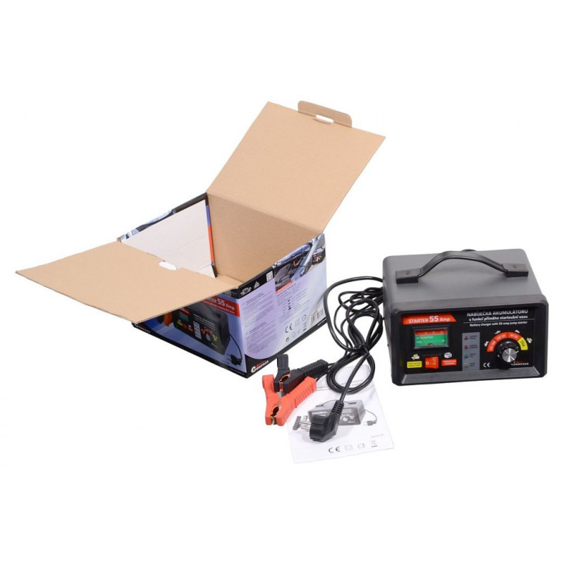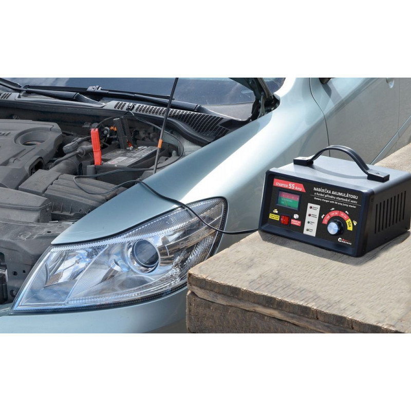 Nabíjačka akumulátorov 6 / 12 V 10 A s napájaním 230 V as funkciou priameho štartovania vozidla. Funkcia STARTER 55 Amp umožňuje naštartovať vozidlo s vybitou batériou tak, ako kedy bolo štartované pomocou štartovacích káblov z iného vozidla. Nabíjačka akumulátora umožňuje nabíjať rýchlo alebo pomaly (veľmi šetrne) autobatérie 12 V aj 6 V a je vhodná pre kapacitu batérie až 100 Ah. Je určená na nabíjanie olovených akumulátorov.