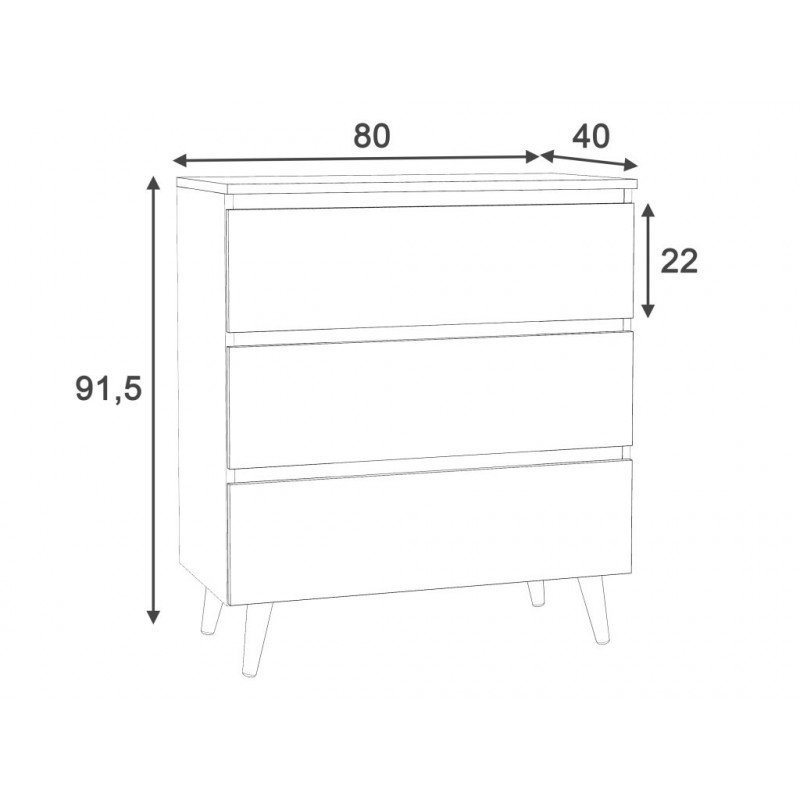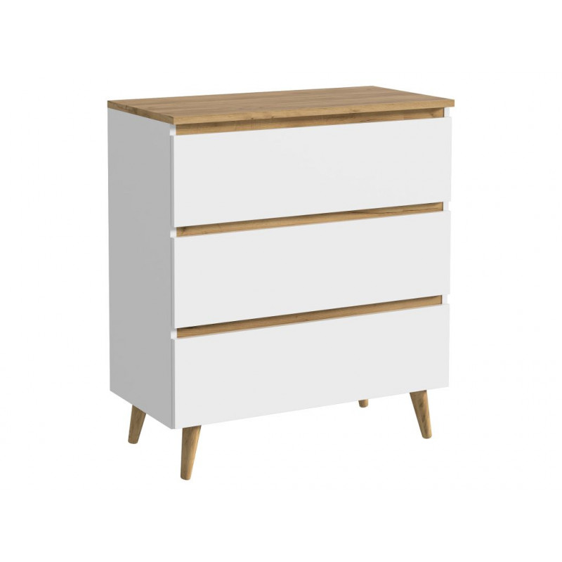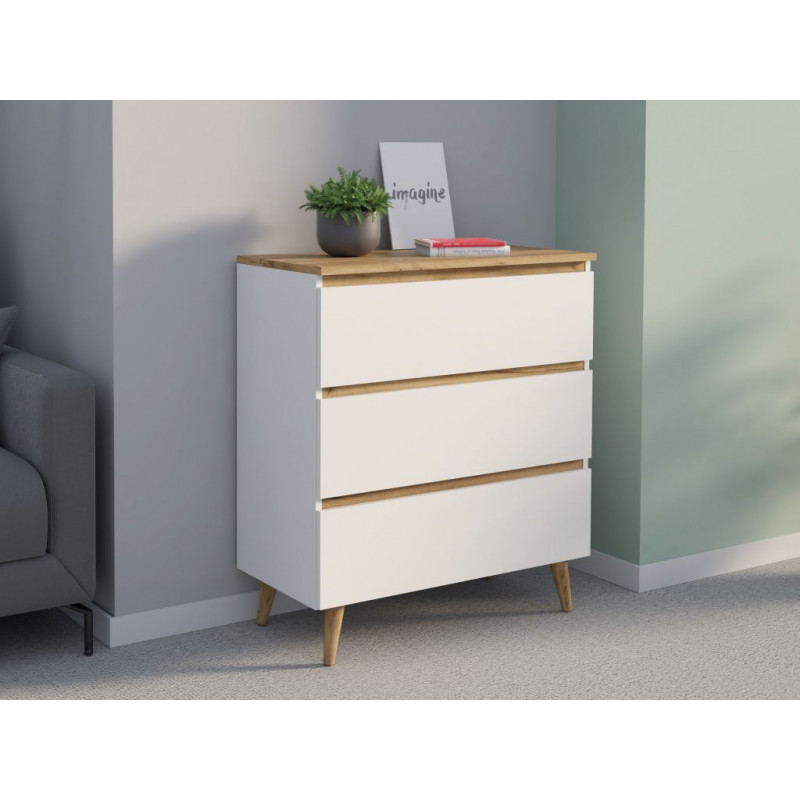 Elegantná komoda so šírkou 80 cm spája jednoduchosť škandinávskeho štýlu s nadčasovou funkčnosťou. Kombináciou bielej farby s prírodným odtieňom duba craft prináša do interiéru úľavu a sviežosť, zatiaľ čo vďaka minimalistickej forme je vhodná do moderných aj tradičnejších priestorov.