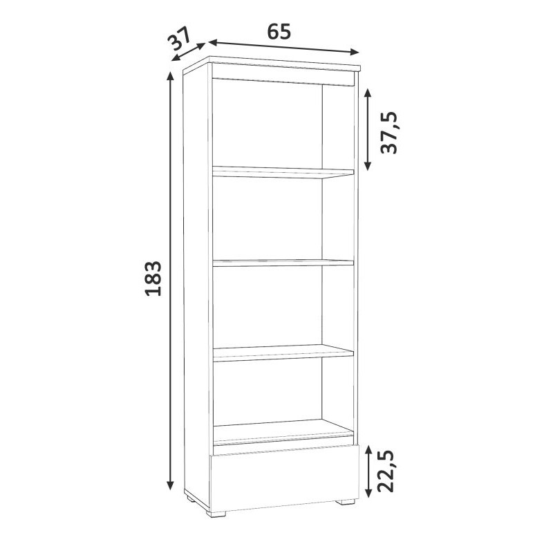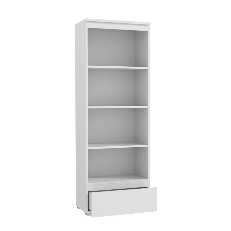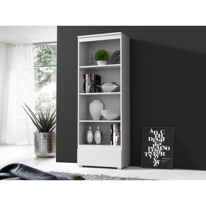 Moderná priestranná policová skriňa spája minimalistický dizajn s praktickosťou. Je vybavená štyrmi otvorenými policami na knihy, zakladače, dekorácie alebo kancelárske doplnky, ako aj hlbokou výsuvnou zásuvkou na drobné predmety a dokumenty.