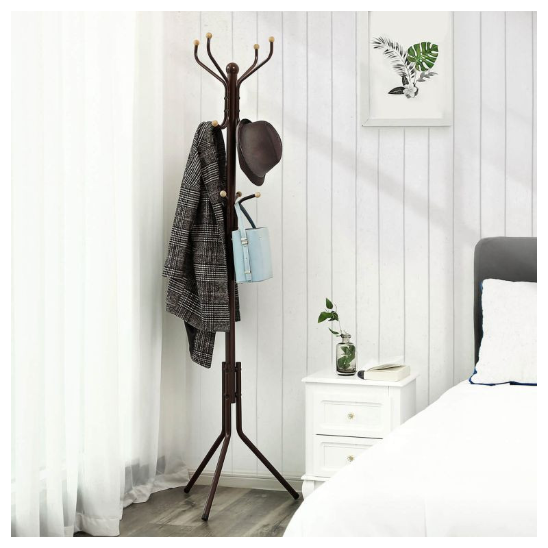 Stabilná kovová konštrukcia s 12 háčikmi ponúka dostatok priestoru na každodenné využitie. Protišmykové krytky chránia vašu podlahu, zatiaľ čo odolná povrchová úprava zaisťuje ľahkú údržbu a dlhú životnosť. Muž ocenia jednoduchú montáž s priloženým kľúčom, nízku hmotnosť a praktické rozmery, vďaka ktorým stojan ľahko premiestni alebo uskladní.