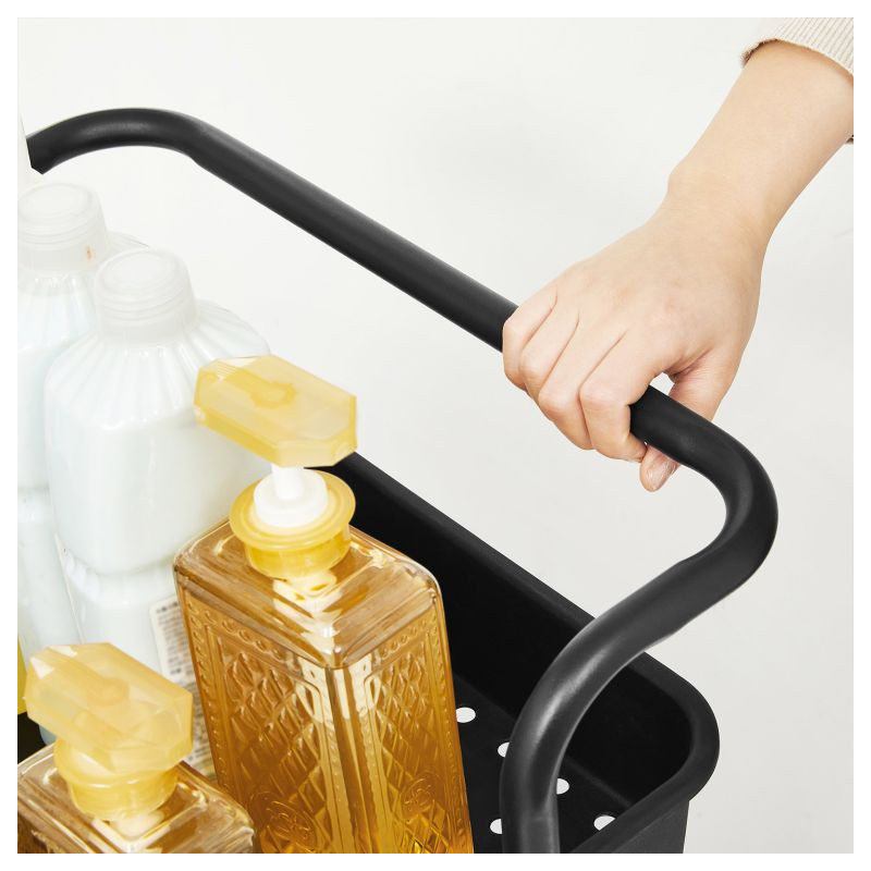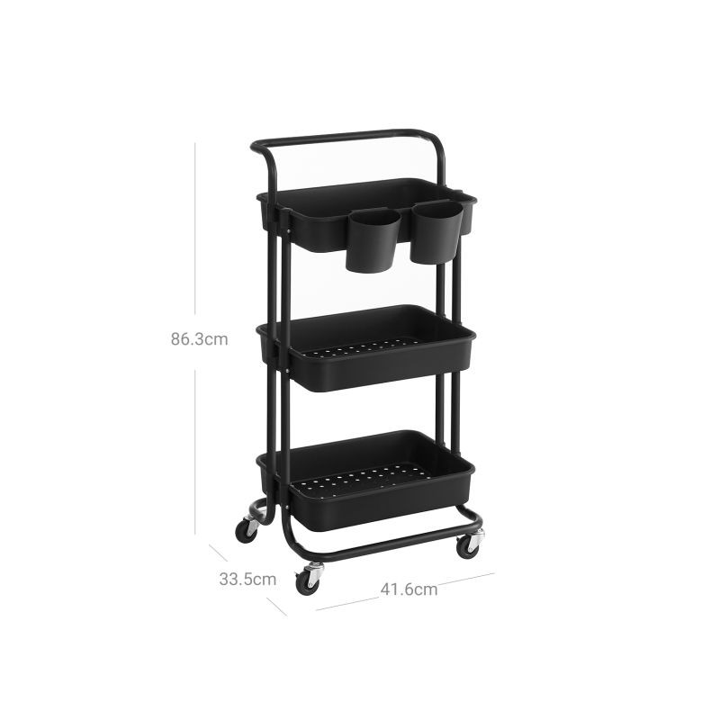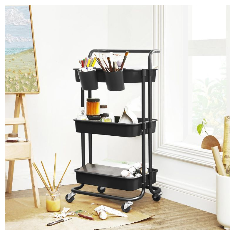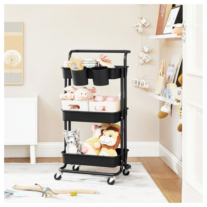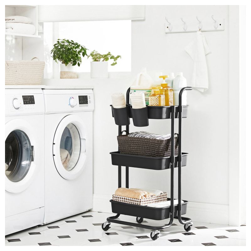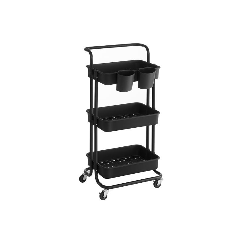 Vytvorte viac priestoru a prehľadnosti. Táto čierna mobilná polička s tromi policami a dvoma závesnými organizérmi je skvelým pomocníkom v kuchyni, kúpeľni a pracovni. Môžete ju ľahko presunúť tam, kde ju potrebujete, a tak maximálne využiť každý centimeter.