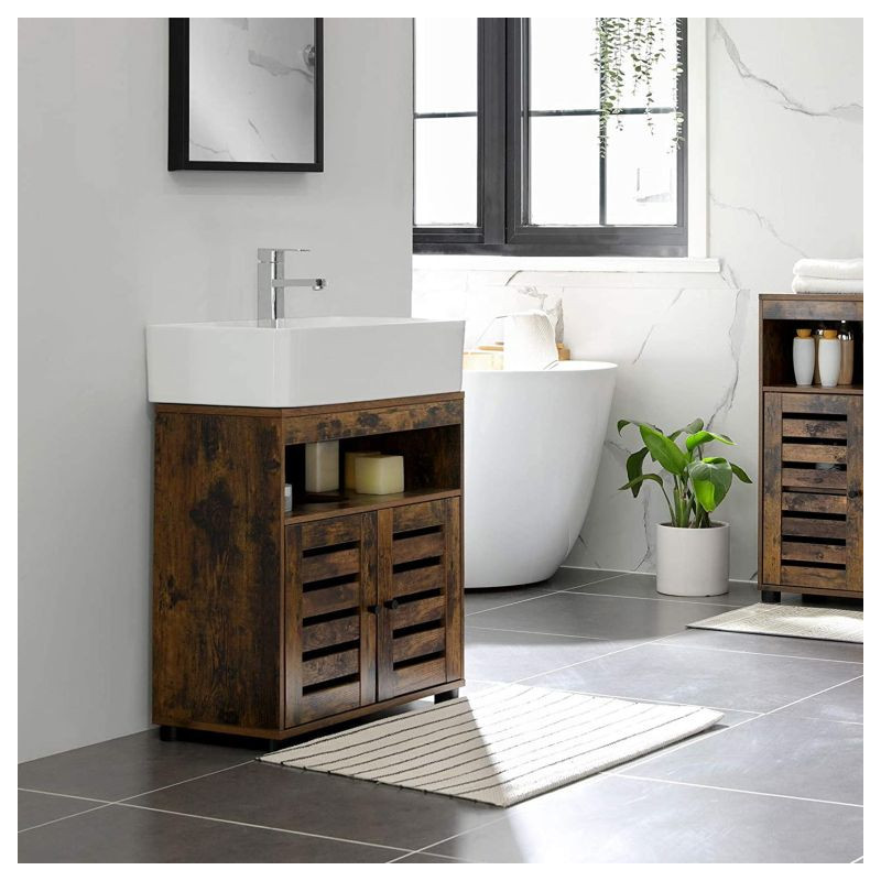 Dodajte svojej kúpeľni osobitý štýl s rustikálnou skrinkou VASAGLE pod umývadlo. Kombinácia hnedého drevodekoru a praktického dizajnu s dvojitými lamelovými dvierkami vytvára harmóniu medzi funkčnosťou a estetikou. Vďaka kompaktným rozmerom využijete aj priestor, ktorý by inak zostal nevyužitý.