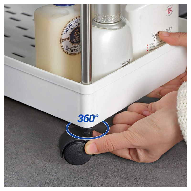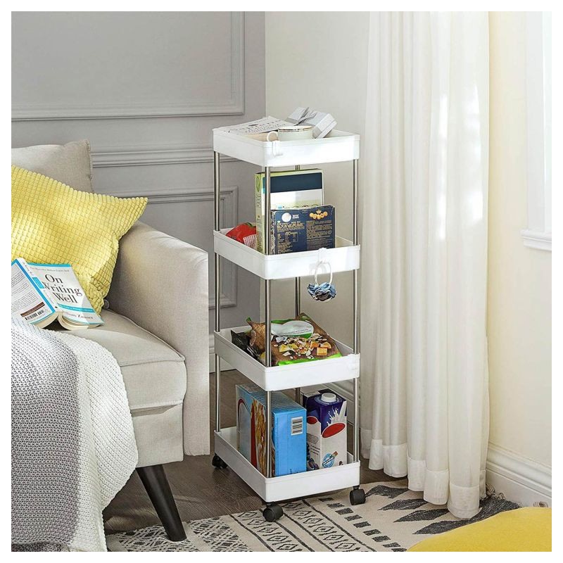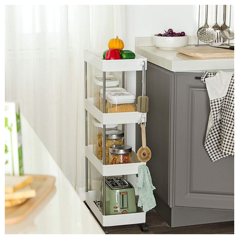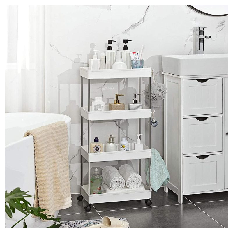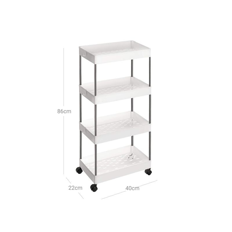 Už žiadny neporiadok! Tento úzky regál na kolieskach vám pomôže zorganizovať kúpeľňu, kuchyňu aj kanceláriu. Vďaka štyrom policam a šiestim háčikom budete mať vždy všetko po ruke a vaša domácnosť získa nový poriadok. Elegantný biely design navyše skvele zapadne do každého interiéru.
