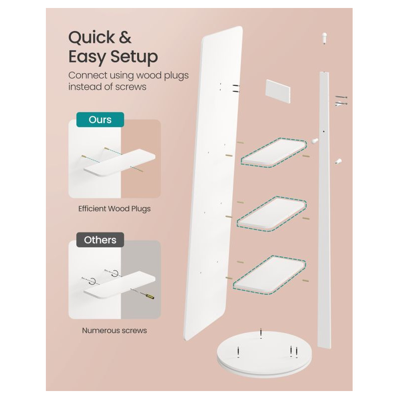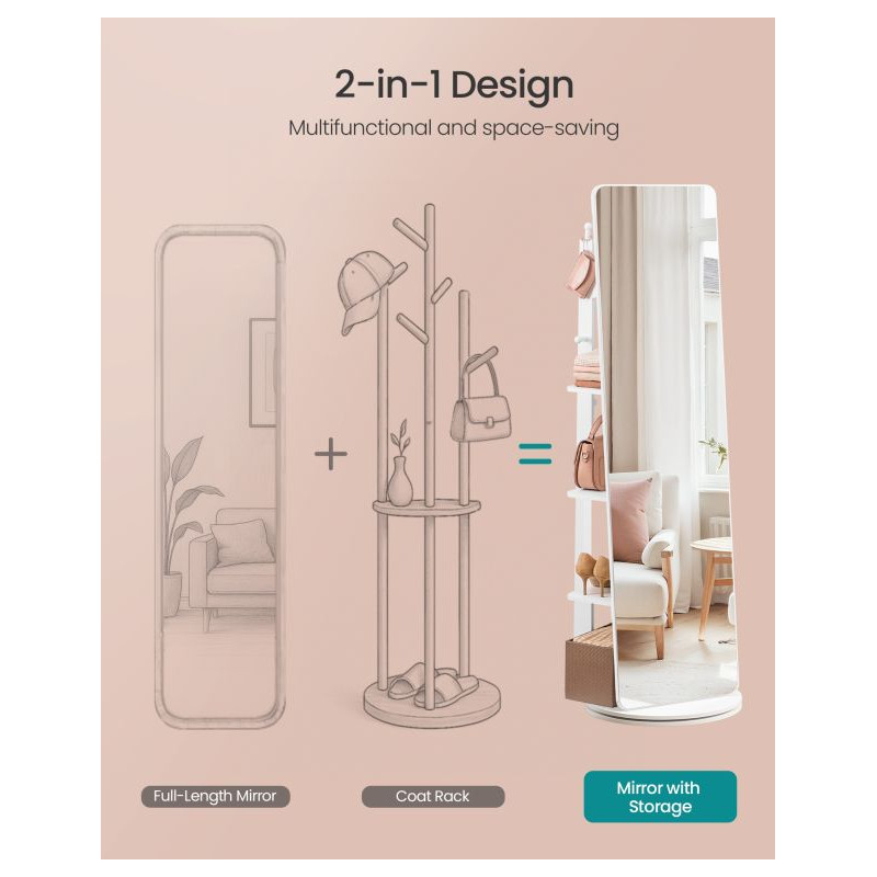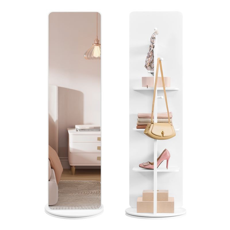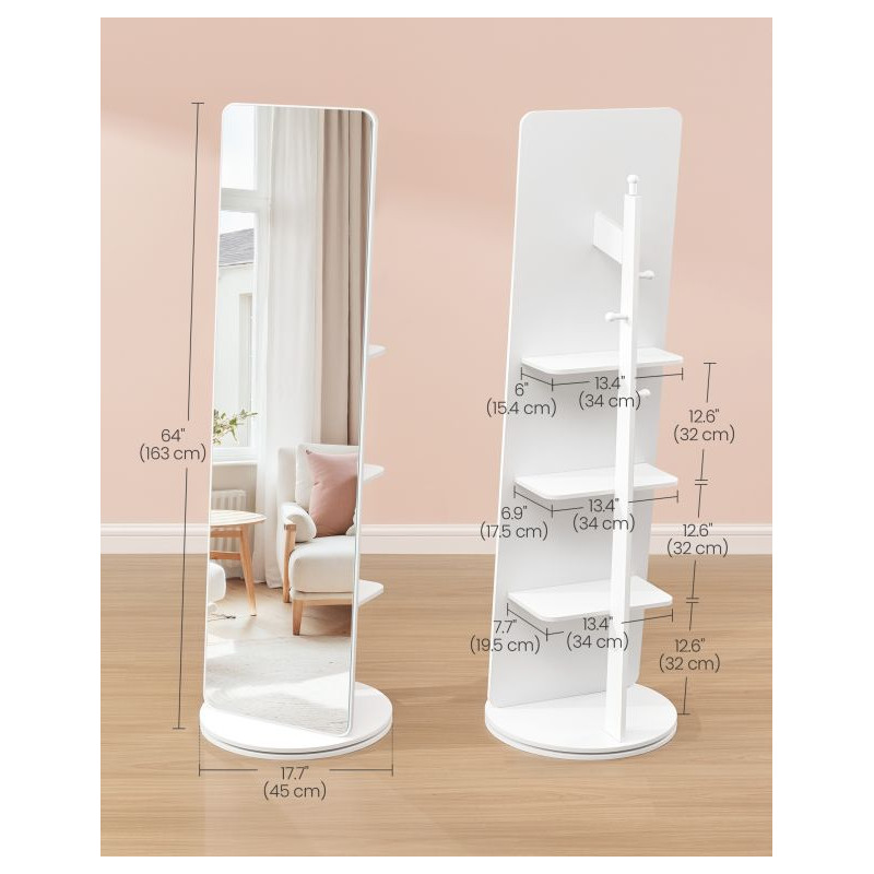 Objavte kombináciu štýlu a praktickosti v jednom produkte. Toto vysoké zrkadlo s minimalistickým dizajnom a čistou bielou farbou dokonale doplní vašu spálňu, chodbu alebo šatník. Všetko, čo potrebujete, máte vždy po ruke vďaka 4 policám a 4 háčikom na zadnej strane. Otočný mechanizmus vám umožňuje ľahký prístup ku všetkým uloženým veciam a zároveň si môžete vychutnať perfektný pohľad na celé svoje oblečenie.