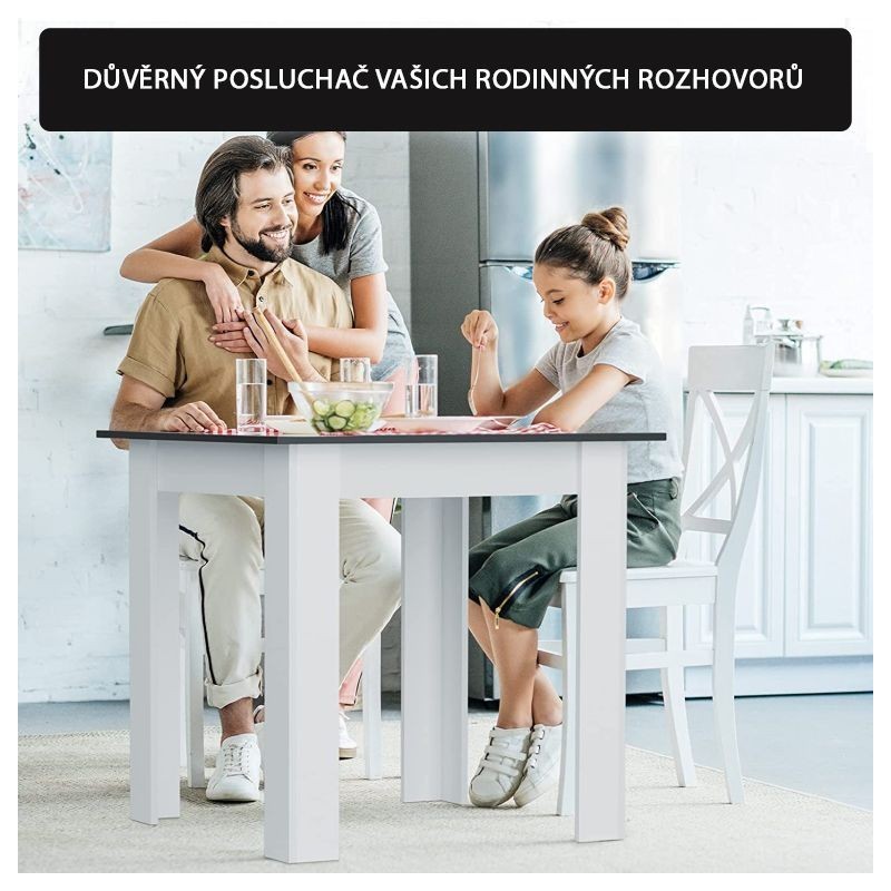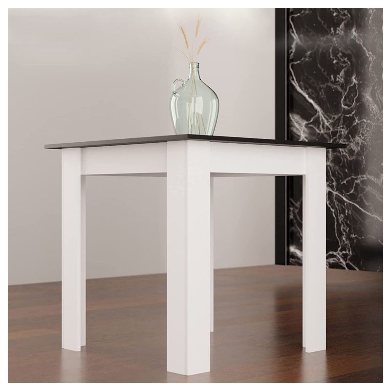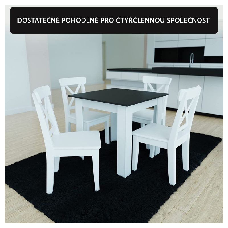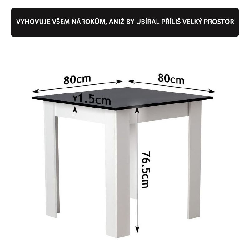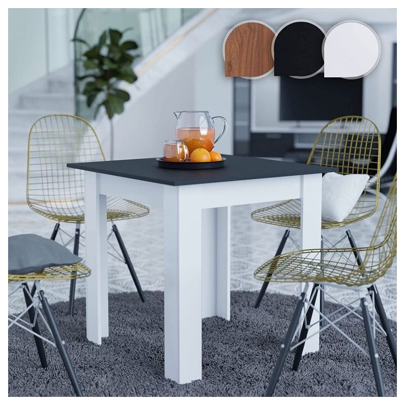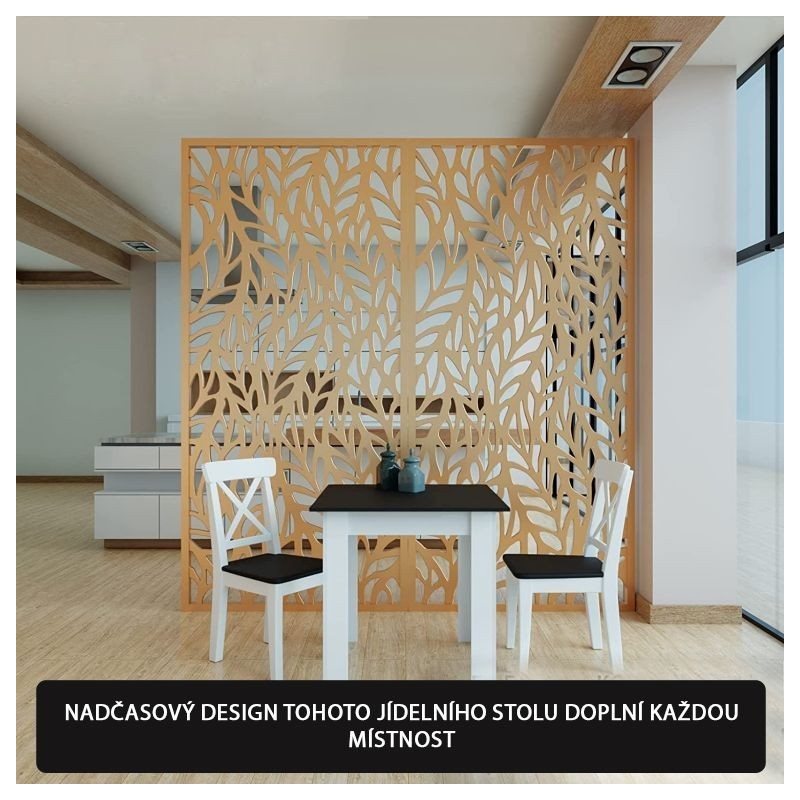 Tento elegantný jedálenský stôl sa hodí do každého bytu a domu. Kompaktná veľkosť tohto jedálenského stola je ideálna do malej kuchyne aj obývačky. Kuchynský stôl je vyrobený z ľahko udržiavateľnej MDF konštrukcie s bielymi nohami a stolnou doskou v čiernej farbe, povlak z melamínovej živice sľubuje dlhú životnosť. Tento tradičný stôl je tou správnou voľbou na spojenie rôznych štýlov. Nadčasový dizajn tohto jedálenského stola doplní každú miestnosť.