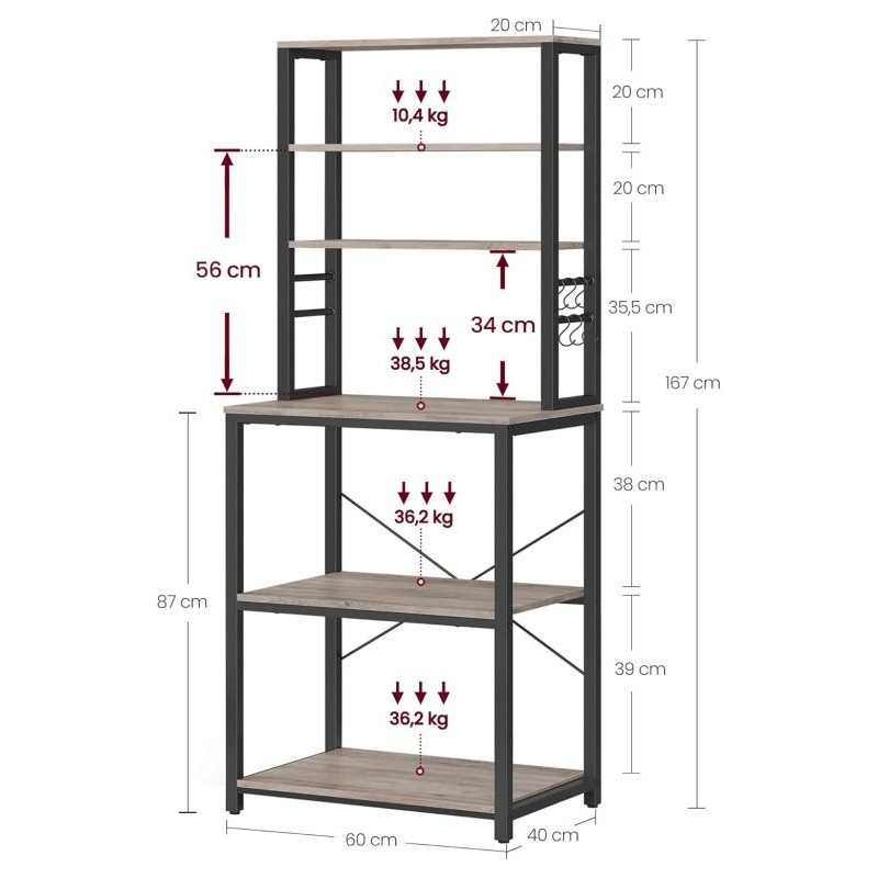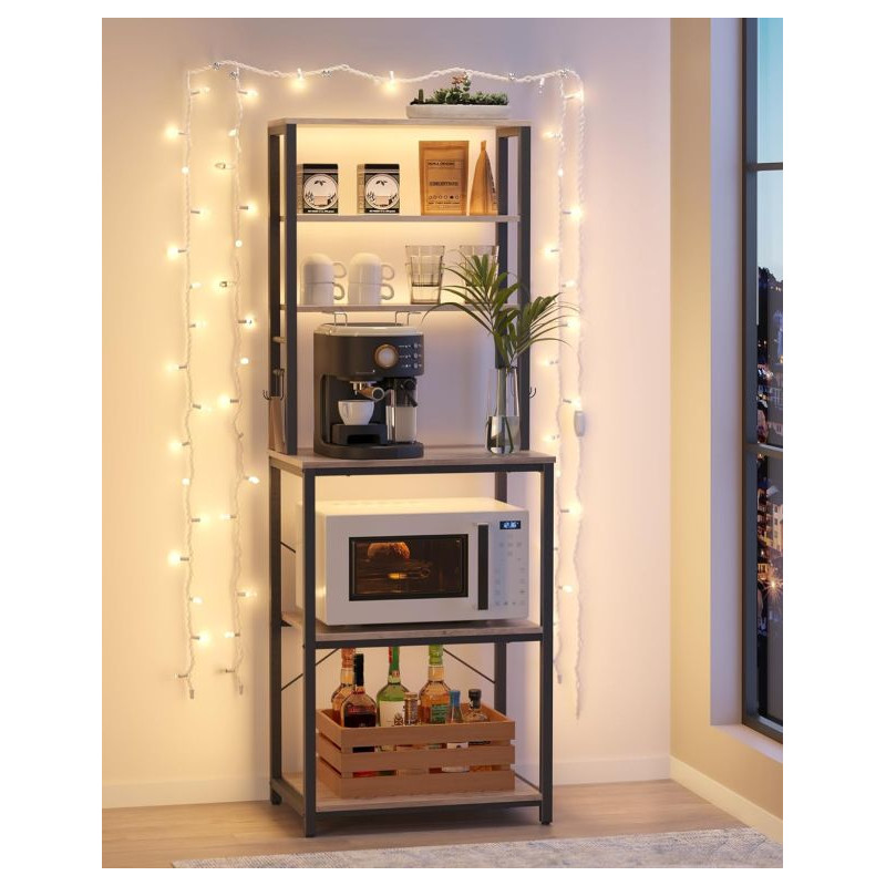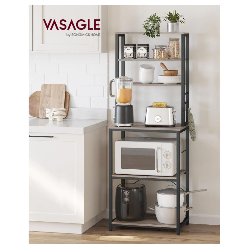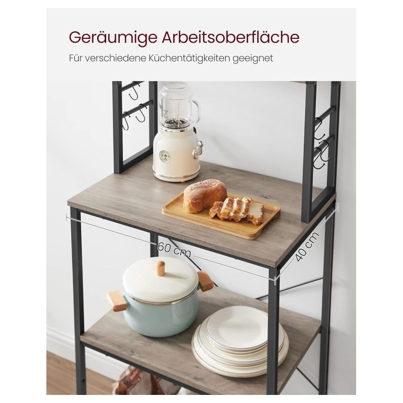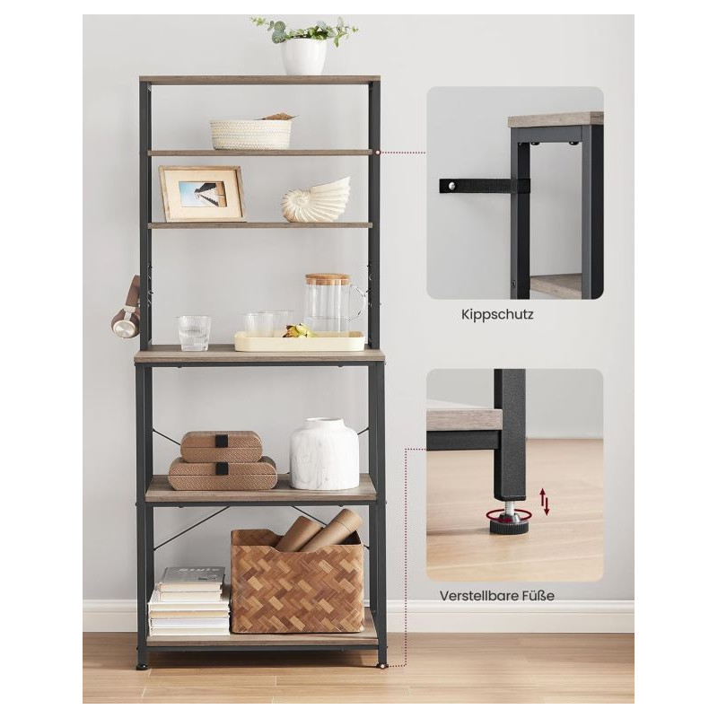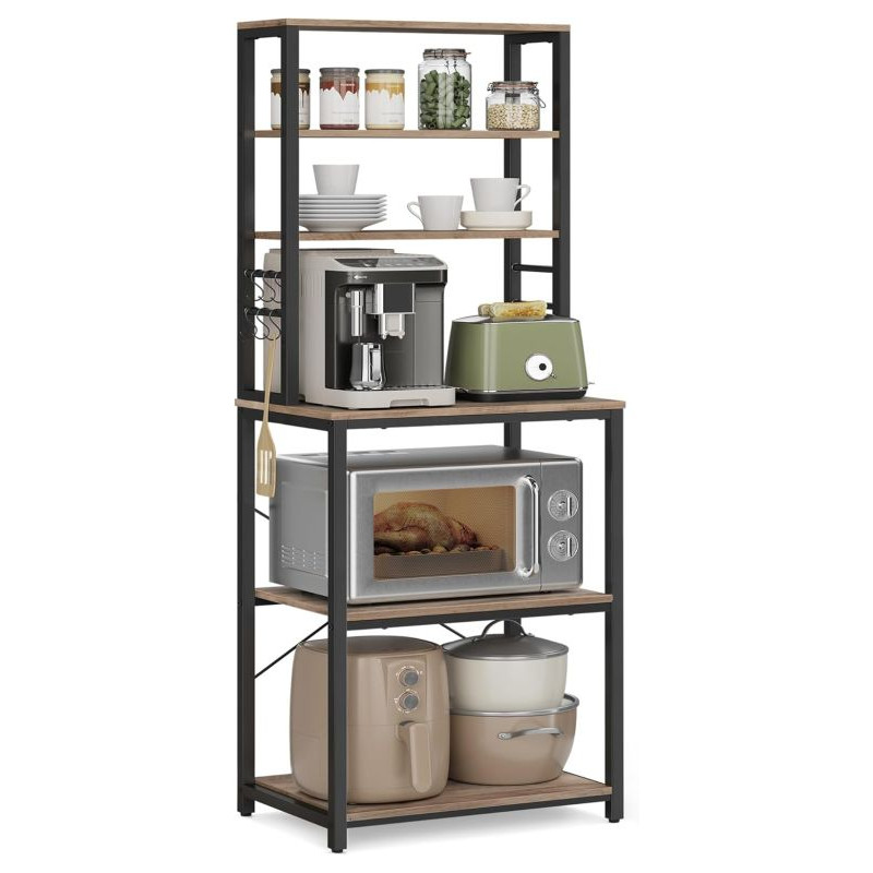 Vneste do svojho domova prehľadnosť a štýl. Tento praktický kuchynský regál s rustikálnym dreveným dekorom a čiernou oceľovou konštrukciou dodá interiéru osobitý industriálny nádych. Šesť políc a šesť háčikov ponúkajú dostatok priestoru pre mikrovlnku, kávovar aj kuchynské potreby. Vďaka univerzálnemu dizajnu sa hodí nielen do kuchyne, ale aj do jedálne, pracovne či obývacieho priestoru.
