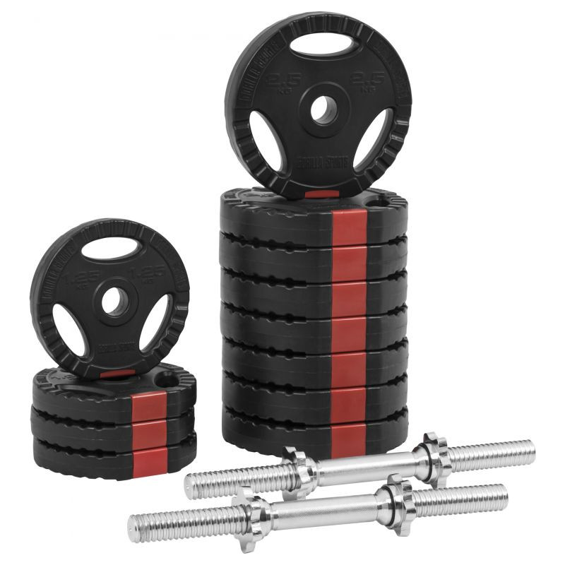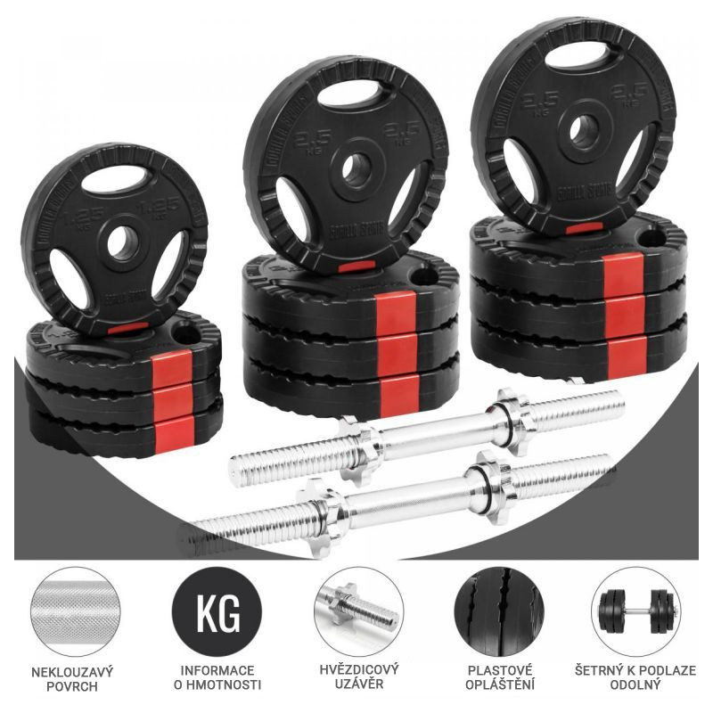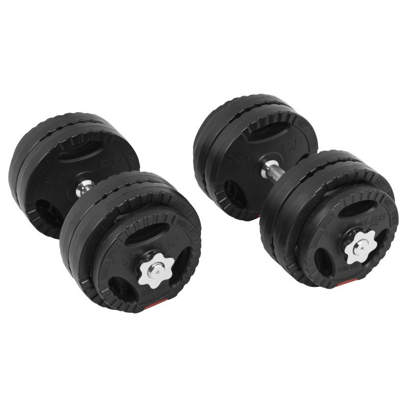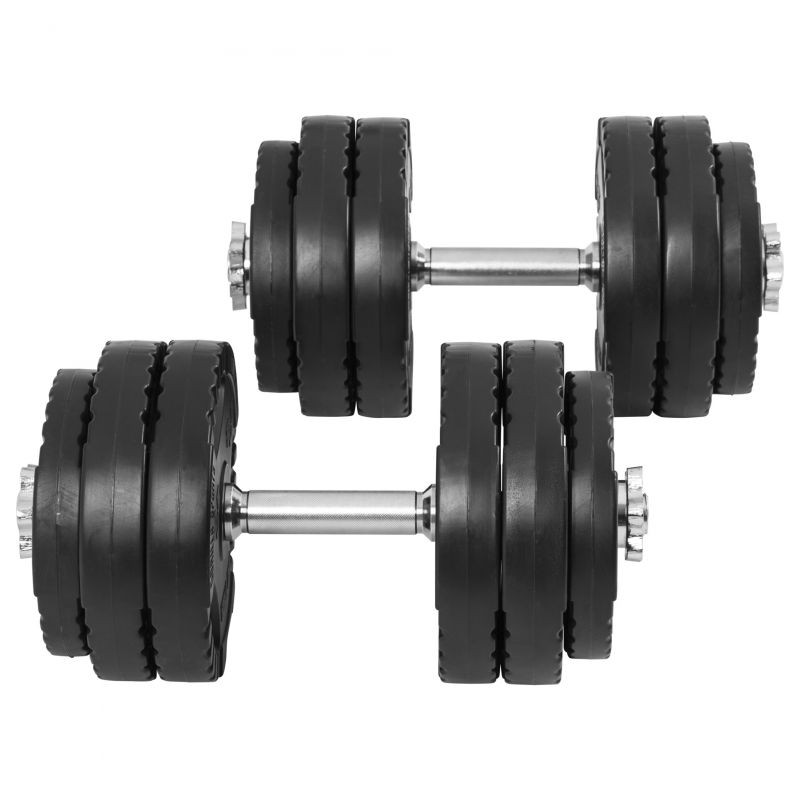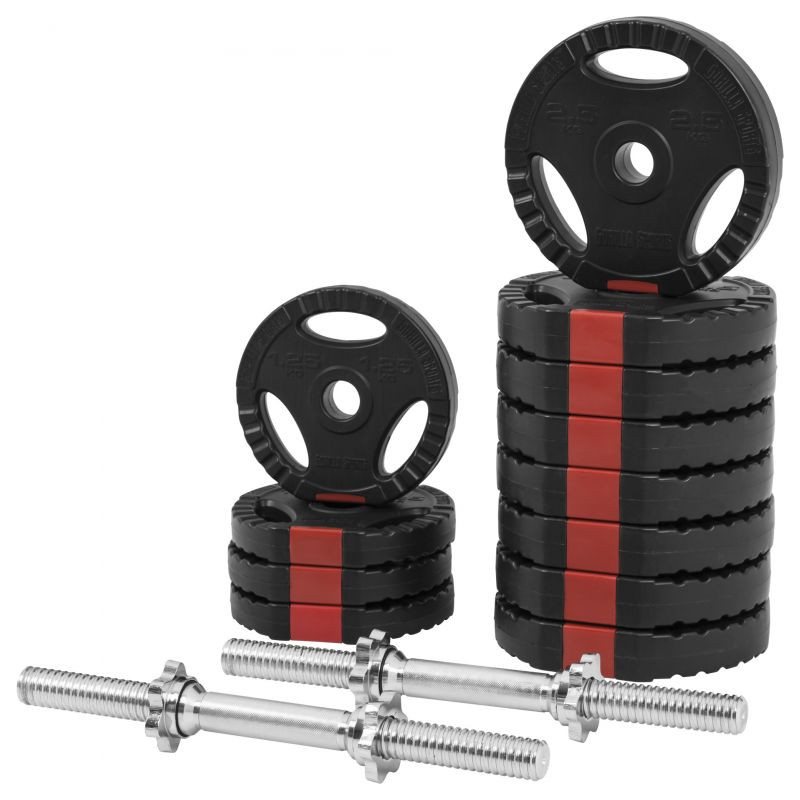 Táto jednoručková sada sa skladá z dvoch tyčí jednoručiek a 12 závaží s celkovou hmotnosťou 30 kg. Jednoručky majú praktické a bezpečné použitie - na tyčiach je vrúbkovanie pre pevné uchopenie a priložené matice s gumennými podložkami bezpečne fixujú závažia, aby bol tréning bezpečný aj bez partnera!