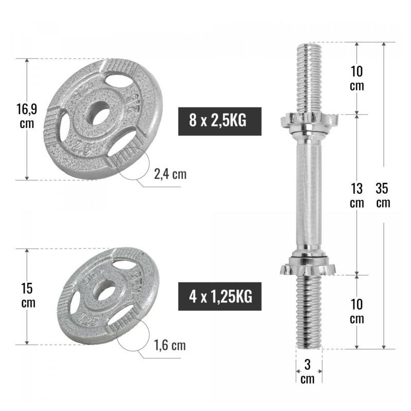 • 2 jednoručné tyče 35 cm ( hmotnosť 2,5 kg každá )