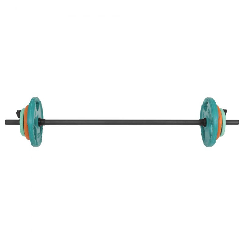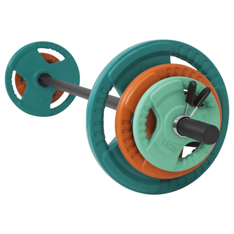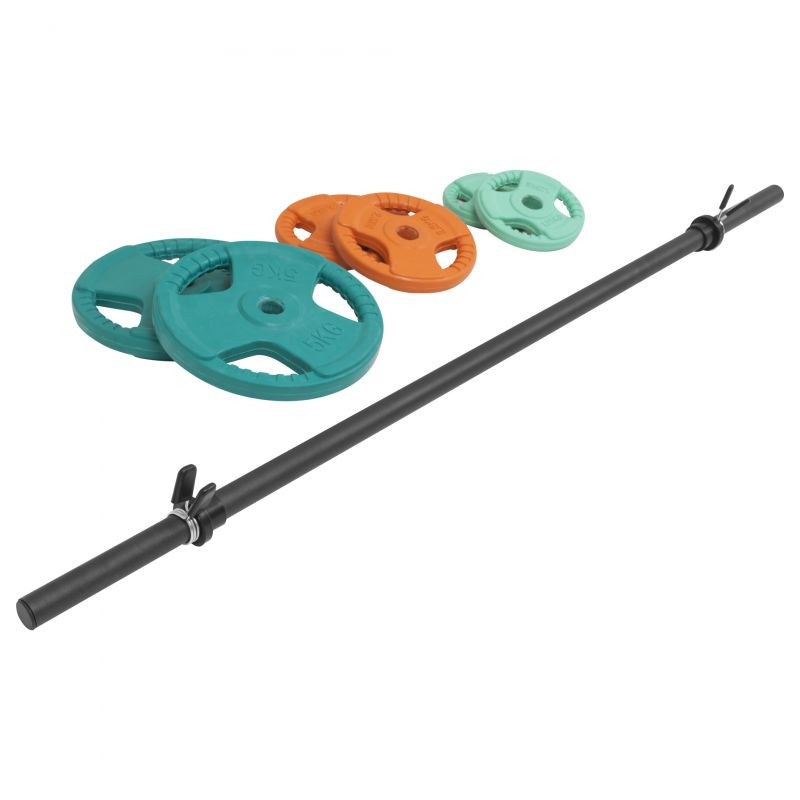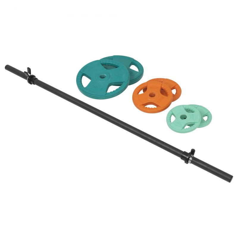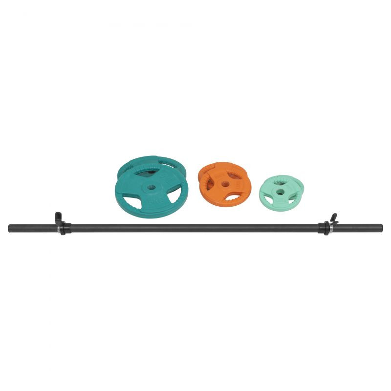 Ľahká 130 centimetrov dlhá aerobik činková tyč a šesťdielny set pogumovaných liatinových kotúčov s gripom poskytuje perfektné vybavenie pre aeróbne cvičenie so závažím, ktoré si môžete vďaka vymeniteľným kotúčom 1.25, 2.5 a 5 kg upravovať podľa potreby. Tým môžete kontrolovať intenzitu Vášho tréningu .