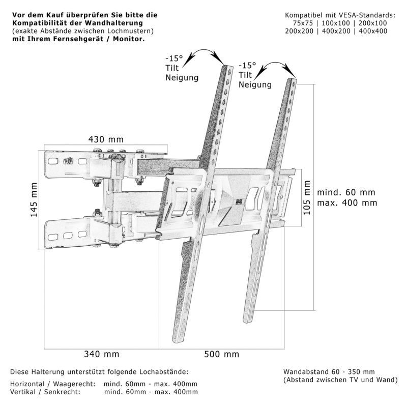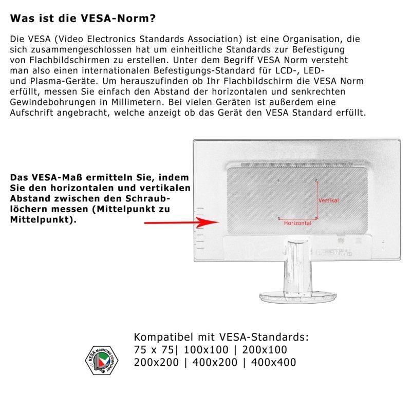 VYSOKÁ KOMPATIBILITA: držiak na stenu má max. vzdialenosť otvoru 400 x 400 mm a je v súlade so štandardmi VESA rozstupom otvorov: 75x75 / 100x100 / 200x100 / 200x200 / 400x200 / 300x300 / 400x300 / 400x400.
