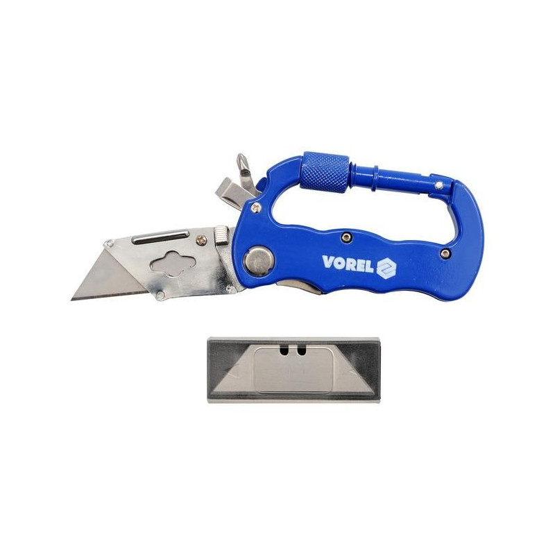 Precízny vreckový nôž "karabína s britom". Vďaka tomuto štýlovému vreckovému nožu v štýle karabíny budete mať vždy po ruke malý užitočný nástroj. Karabína samotná je zhotovená z hliníka s rozmermi 9,5 x 5,2 cm s hrúbkou 1,5 cm a je vybavená skrutkovacou poistkou. Navyše v sebe skrýva dva nadstavce, a to plochý a krížový skrutkovač. Nôž je tiež vybavený poistkou proti nechcenému uzavretiu. Brit má rozmery 61 x 33 x 0,5 mm. V balení je 5 ks náhradných britov v praktickom plastovom puzdre.