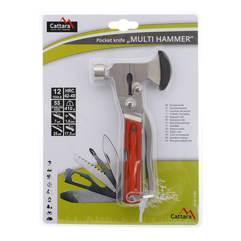 Multi Hammer je multifunkčný nôž v celokovovom prevedení s drevenými strienkami. Najvýraznejšími časťami sú kladivo a sekerka. Po rozopnutí poistky na konci rukoväte sa v prednej časti odhalia čeľuste, ktoré môžu byť použité ako kombinované kliešte. Ďalej sa ponúka klasický nôž dĺžky 7 cm, krížový skrutkovač najbežnejších rozmerov, pílka na drevo, odstraňovač šupín rýb a pilník so zakončením, ktorý sa dá použiť ako plochý šrubovák. Posledným nástrojom je otvárak kombinovaný imbusovým nadstavcom.