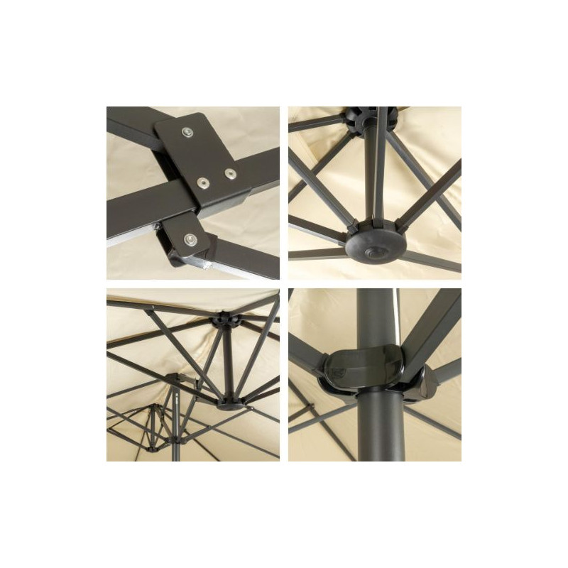 Obrovský slnečník pre Vašu záhradu, balkón, bazén alebo terasu. Vďaka svojej veľkosti ponúka viac tieňa než markíza alebo plážový slnečník a možno ich v prípade potreby prepravovať a uskladniť. Súčasťou podlhovastej oválnej konštrukcie je 12 oceľových rebier.