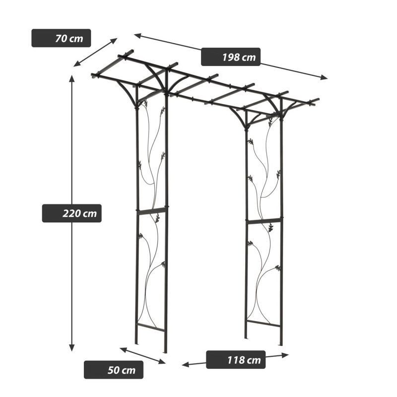 Veľkolepý, mimoriadne široký oblúk ruže z čierno lakovanej ocele. Elegantne tvarované tyče tvoria dekoratívnu mrežu, ktorá na záhrade upúta pozornosť. Horná časť je zámerne jednoduchá. Mreža stojí voľne a nezávisle. Pre ešte väčšiu stabilitu odporúčame oblúkovú mrežu priskrutkovať k dvom základovým doskám na terasových doskách alebo ju upevniť pomocou zemných klincov. Oblúk je pri dodaní demontovaný. Montáž však nie je zložitá a je možné ju vykonať v krátkom čase.