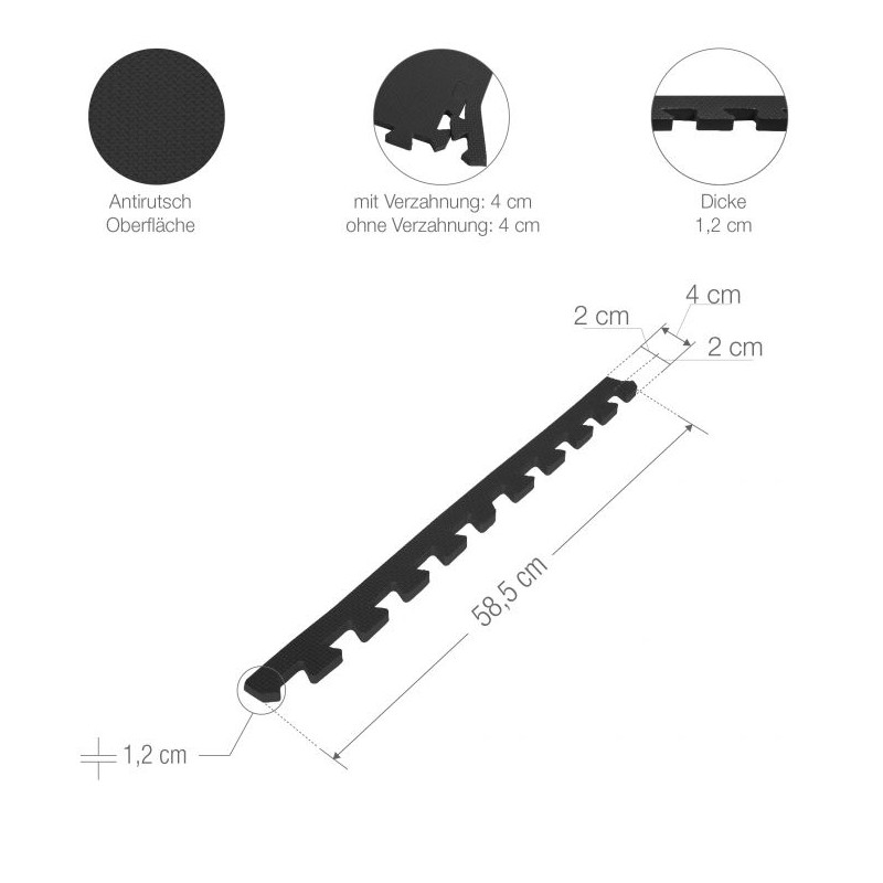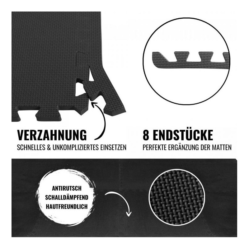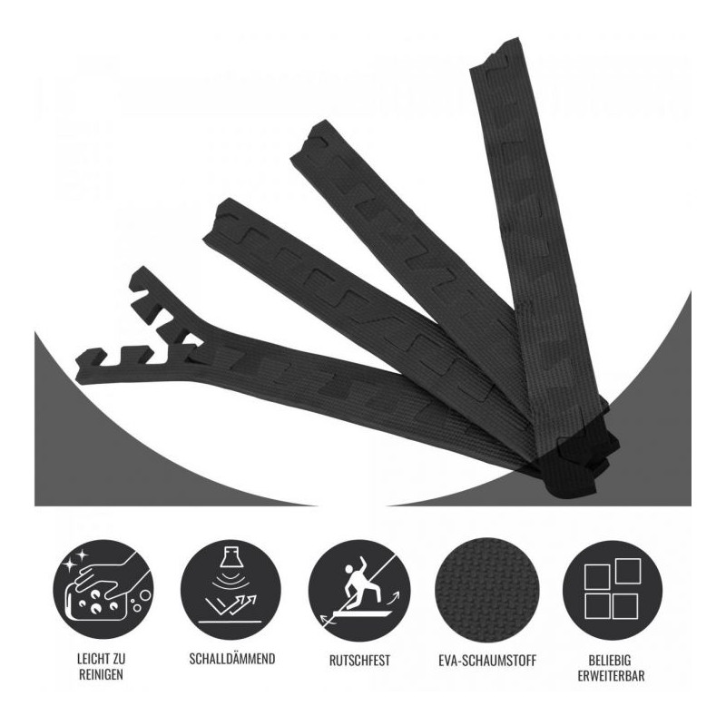 Tieto zakončenia sú ideálne pre našu Puzzle podložku na cvičenie 8 ks. Puzzle podložka chráni podlahu a tlmí zvuky pri tréningu. Vhodné aj ako ochrana tréningových zariadení, taktiež vhodné pre cvičenia ako je skákanie cez švihadlo, joga, naťahovacie cvičenia. Rohože môžu byť spojené a rýchlo rozširovať podložku podľa potreby.