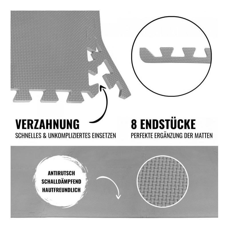 Tieto zakončenia sú ideálne pre našu Puzzle podložku na cvičenie 8 ks. Puzzle podložka chráni podlahu a tlmí zvuky pri tréningu. Vhodné aj ako ochrana tréningových zariadení, taktiež vhodné pre cvičenia ako je skákanie cez švihadlo, joga, naťahovacie cvičenia. Rohože môžu byť spojené a rýchlo rozširovať podložku podľa potreby.