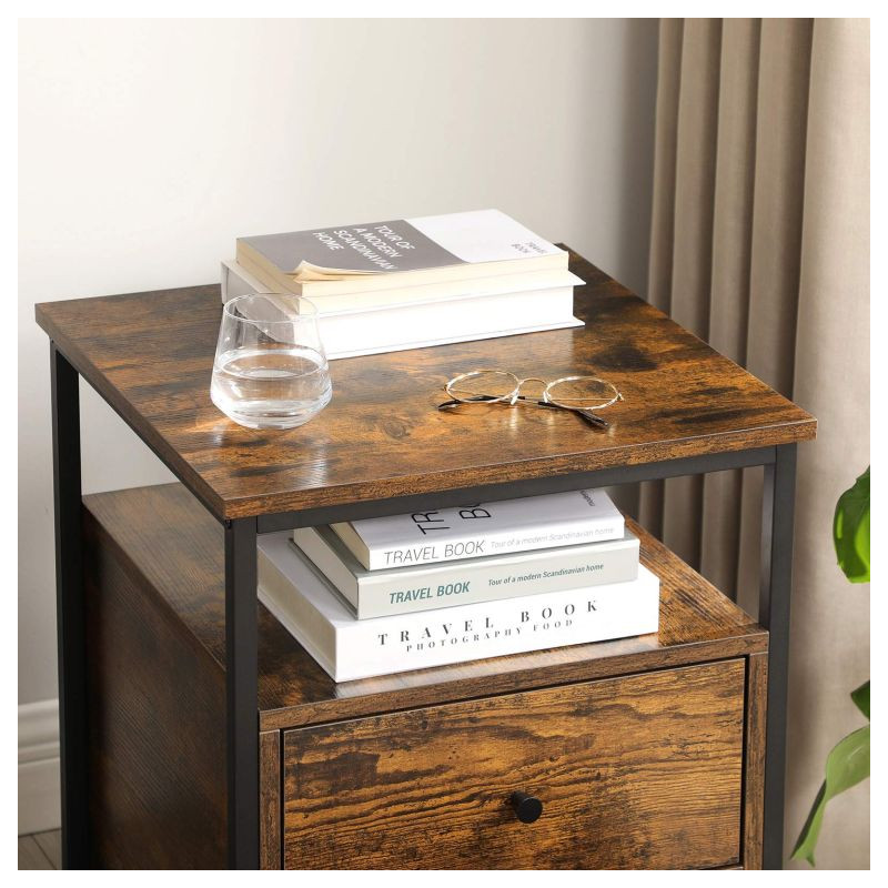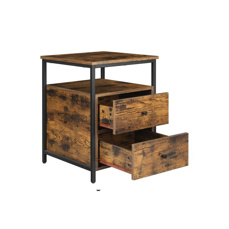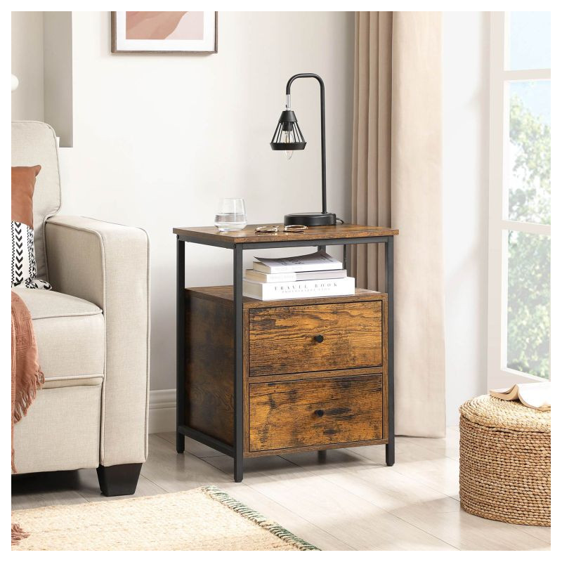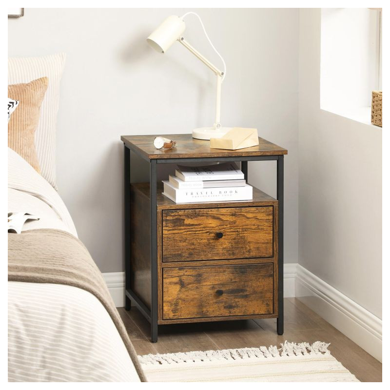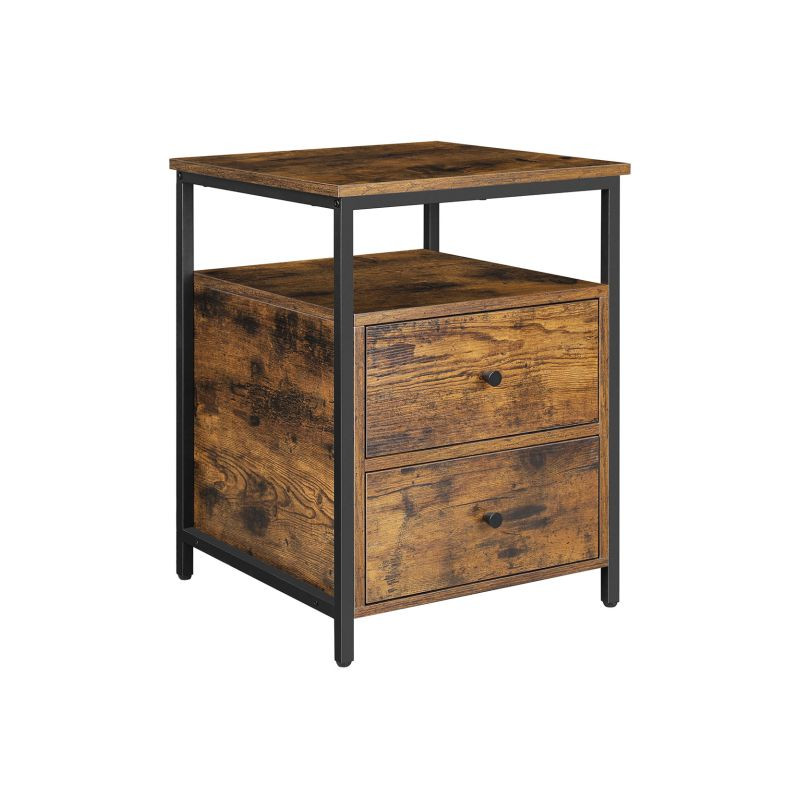 Dodajte svojej spálni štýl s týmto priemyselným nočným stolíkom, ktorý spája praktickosť s moderným vzhľadom. Dve priestranné zásuvky ponúkajú dostatok miesta na všetky vaše nevyhnutné veci, zatiaľ čo otvorená polica je ideálna na knihy alebo dekorácie.