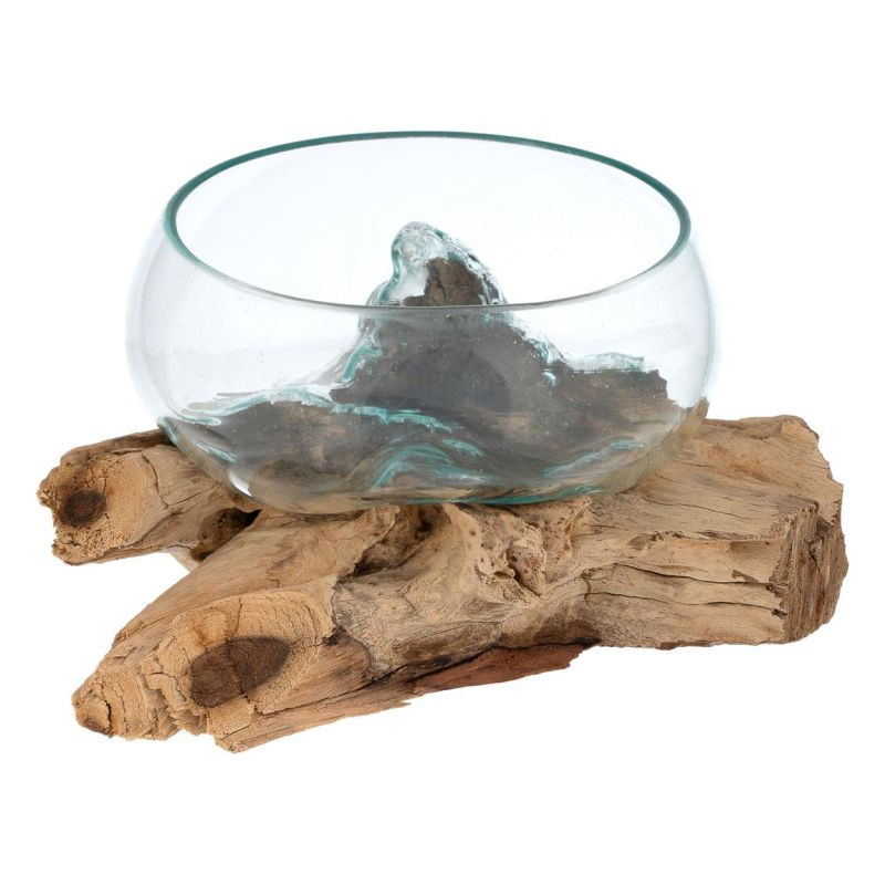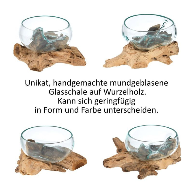Tieto ručne vyrábané sklenené misky na atraktívnom teakovom dreve urobia každý domov ešte krajším. Využite svoju fantáziu a kreativitu a dozdobte si misku podľa vašich predstáv. Táto dekorácia bude skvelá aj ako darček pre priateľov a rodinu. Žiadna priemyselná výroba - pri výrobe sa horúce sklo prikladá na drevo tak, aby sa vytvarovalo podľa jeho tvaru. Vznikajú tak jedinečné kúsky, žiadne dve misky nie sú rovnaké. Keďže sa jedná o čisto prírodný produkt, môžu sa vyskytnúť drobné prasklinky, nepatrné farebné rozdiely alebo malé dierky, čo nemá vplyv na kvalitu výrobku, ale zdôrazňuje jeho jedinečnosť. To isté platí pre prípadné drobné inklúzie vzduchu alebo častíc, ktoré môžu vzniknúť pri ručnej práci.