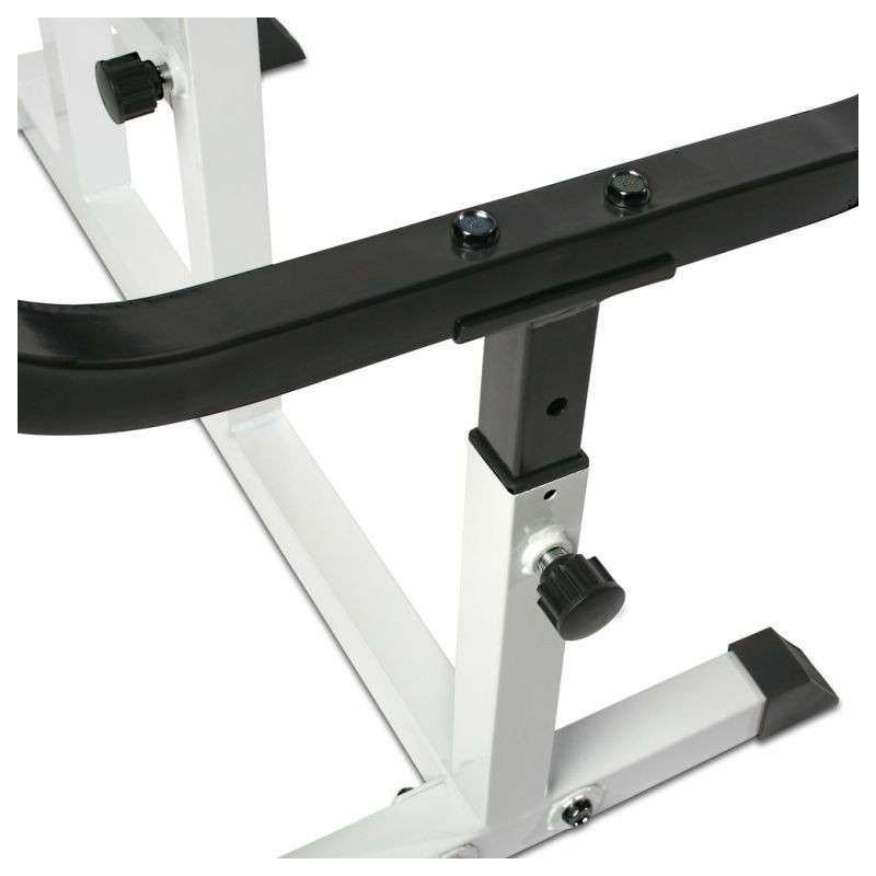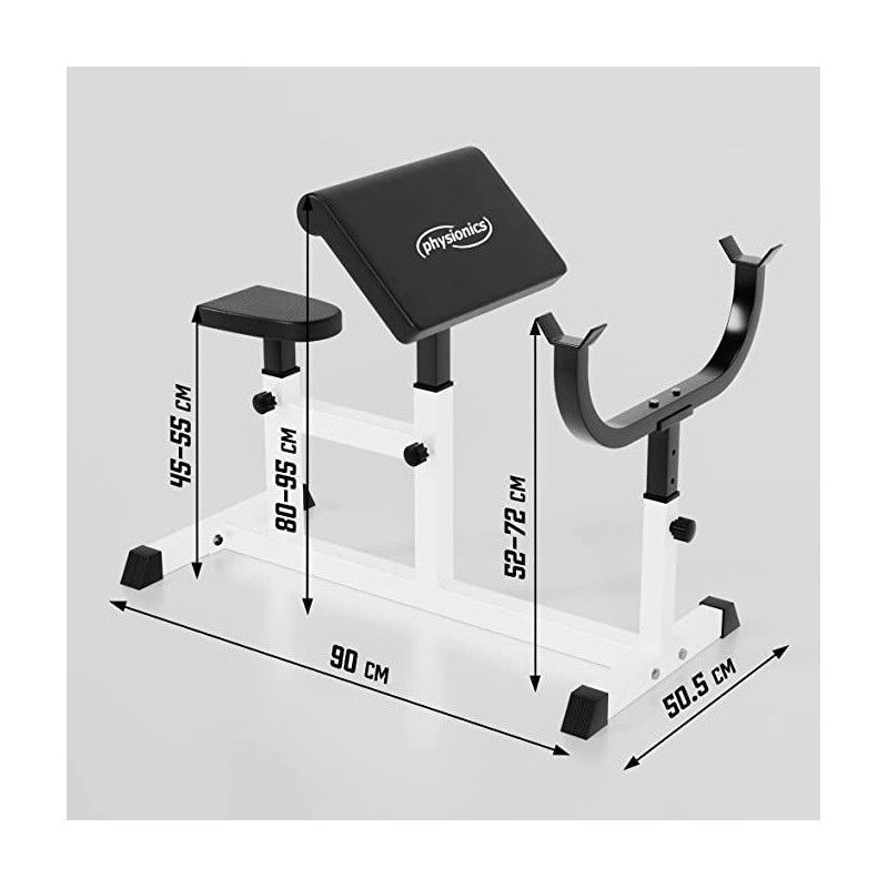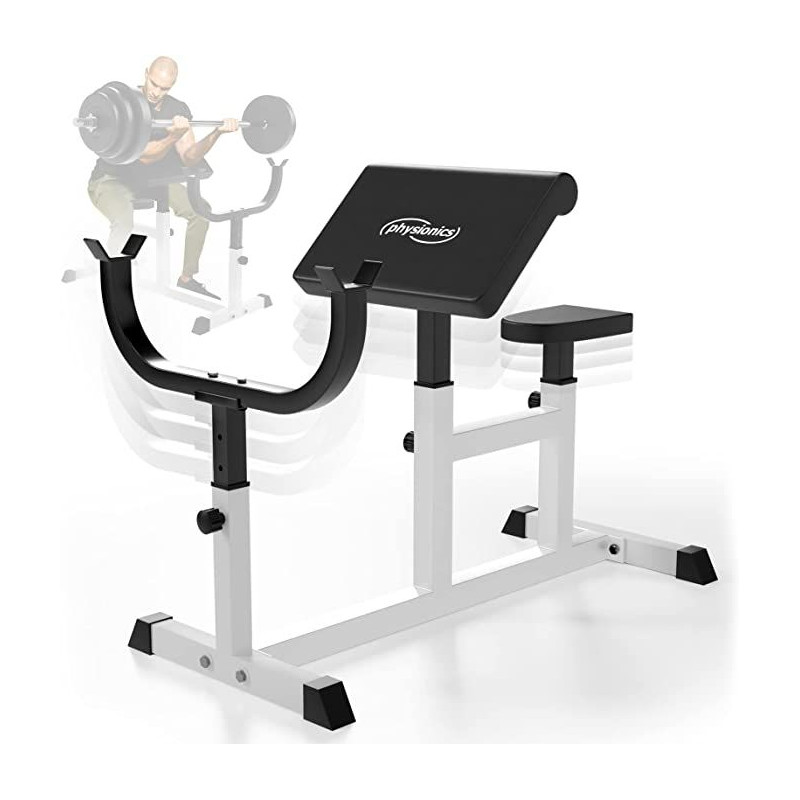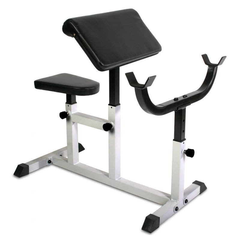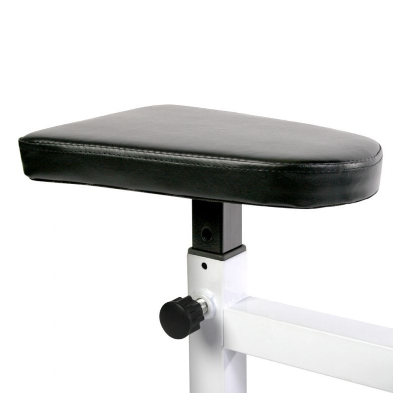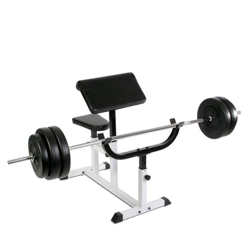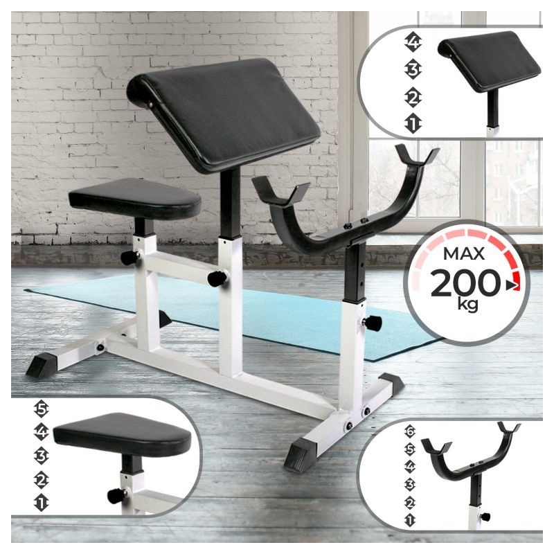 Individuálne nastaviteľná lavica pre čo najlepší tréning. Okrem ohýbačov paží nezaťažuje zakrivená lavica žiadny iný sval. Plastové krytky na pätkách zaisťujú najlepšiu priľnavosť a umožňujú trénovať aj na parketách alebo laminátu bez nepríjemného poškriabania. Stačí sa posadiť na lavičku hlavou dolu, položiť si činku na nohy a hornú časť tela oprieť o opierku. Sedadlo nastaviteľné v 5 úrovniach. Určené pre činku do 60 kg. 4- polohová nastaviteľná lakťová opierka a 6-polohový nastaviteľný stojan na činky.