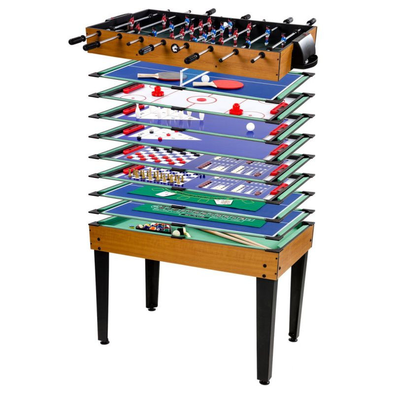 Tento veľký multifunkčný hrací stôl pre 15 hier je vhodný pre rodinu a aj hry s priateľmi! Hracie pole a všetko príslušenstvo (tága, gule, pálky, puk, karty, kocky, figúrky a mnoho ďalšieho) sú umiestnené prakticky pod každou hracou doskou, takže ich máte vždy po ruke. Stôl je vhodný či už do odpočinkovej miestnosti u Vás doma alebo aj do školy či družiny.