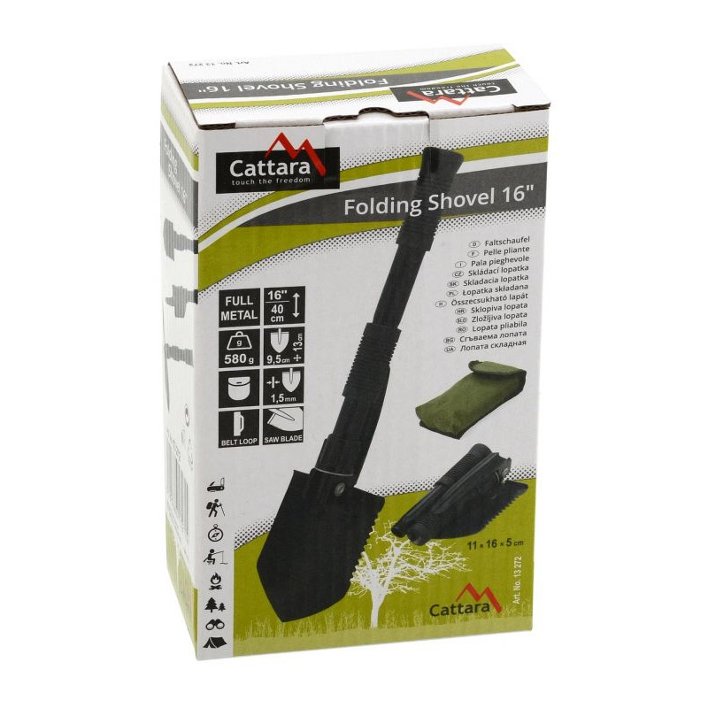 Jedná sa o lopatku, ktorá má rozmery v zloženom stave 9,5 x 16 cm a predávaná je spolu s odolným textilným puzdrom zelenej farby, ktoré je možné pripevniť za opasok.