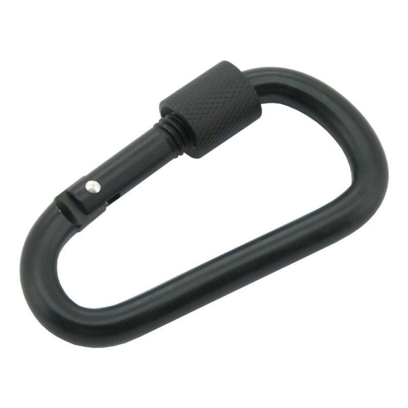 Hliníková karabína opatrená skrutkovacou, prevlečnou poistkou, na zamedzenie nechceného rozopnutia. Karabíny so silou zaistia uchytenie všetkej kempingovej výbavy.