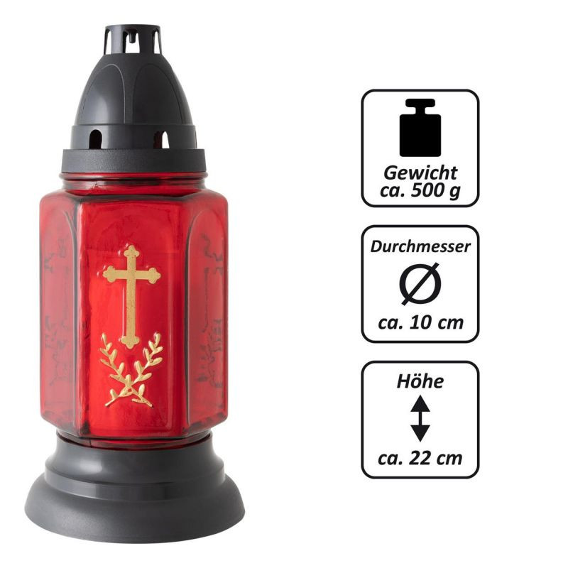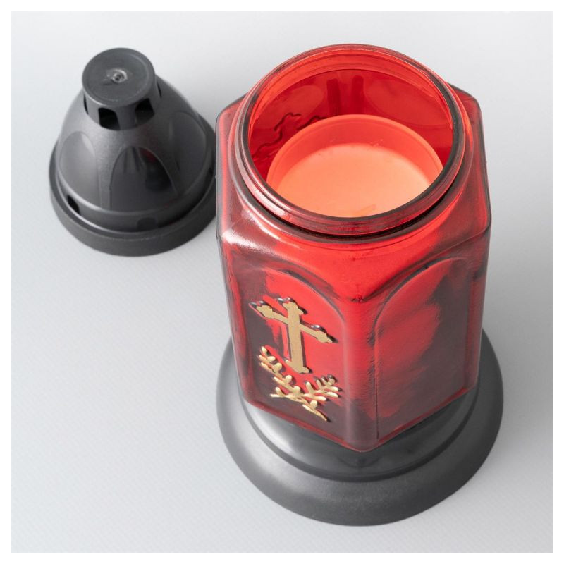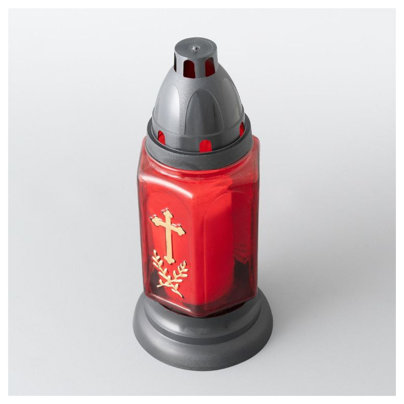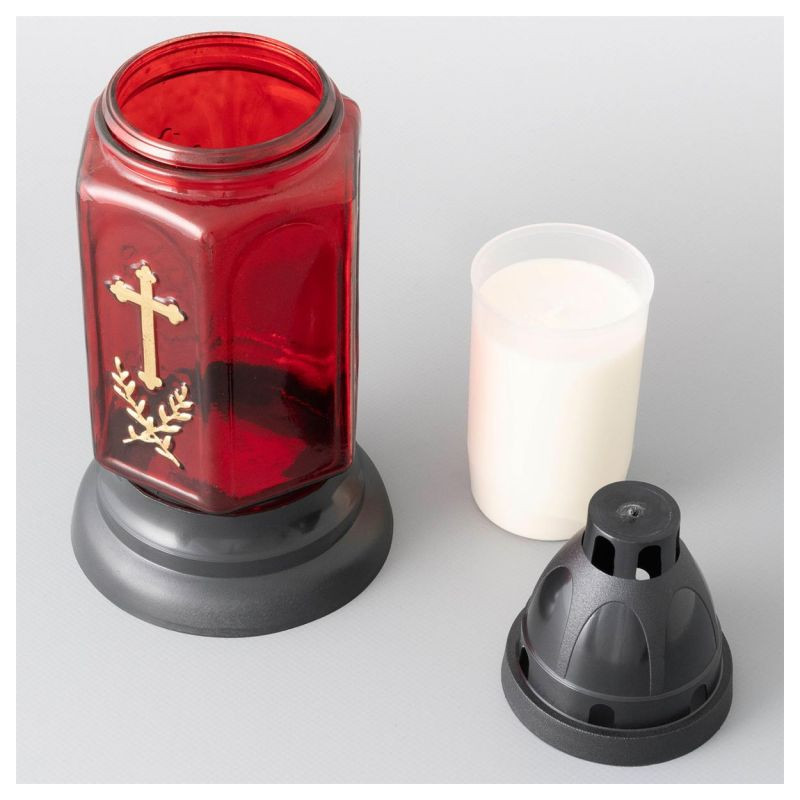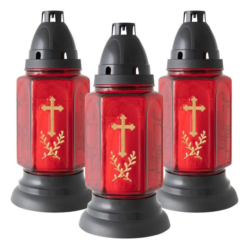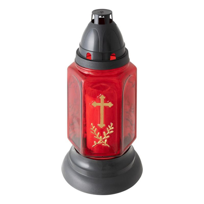 Sklenený kahanec v červenom prevedení s motívom zlatého kríža je vďaka svojmu dizajnu krásnou ozdobou. Kahanec je možno samozrejme umiestniť aj na všetky ostatné miesta, kde sa spomína na zosnulých. Sviečky sa na hrob pokladajú vo zvláštne dni, často počas sviatkov a tiež na konci roka v období tmy.
