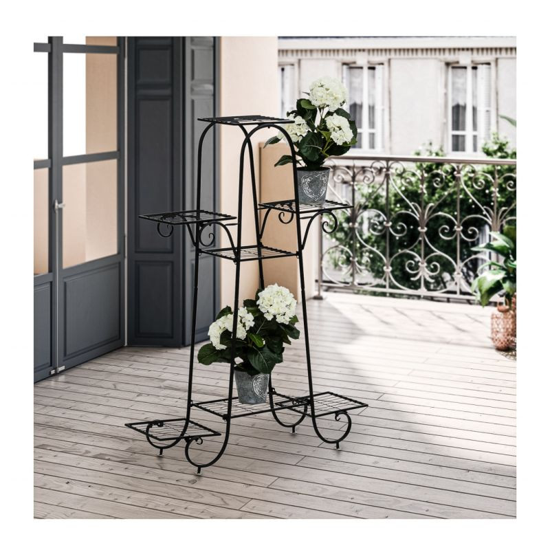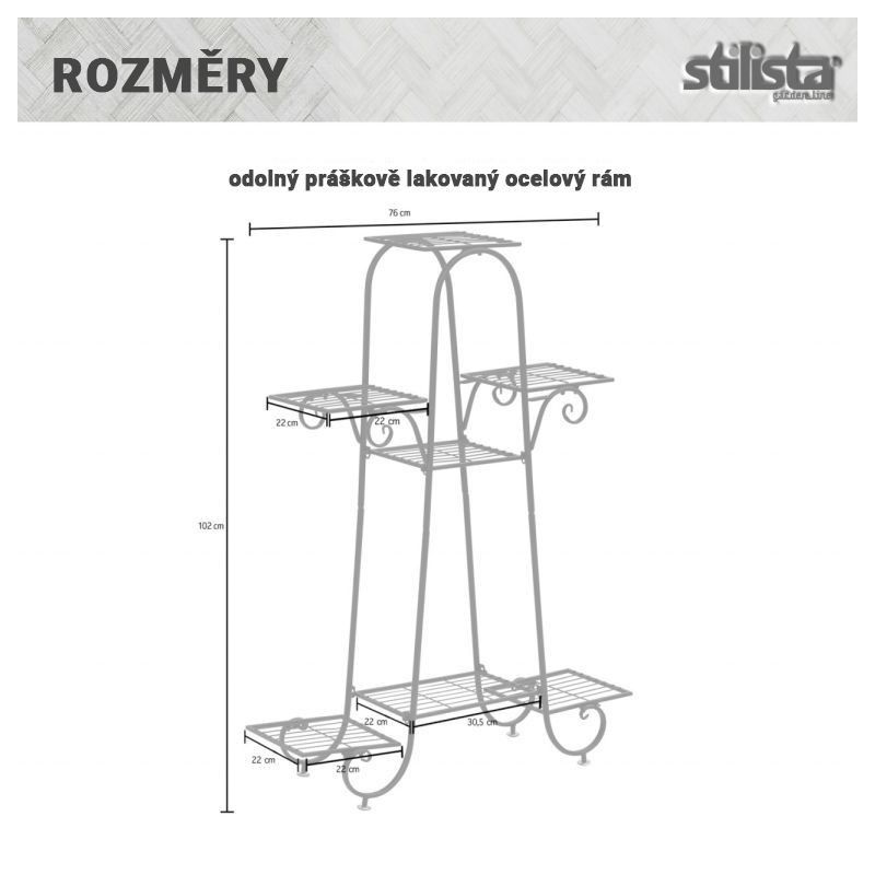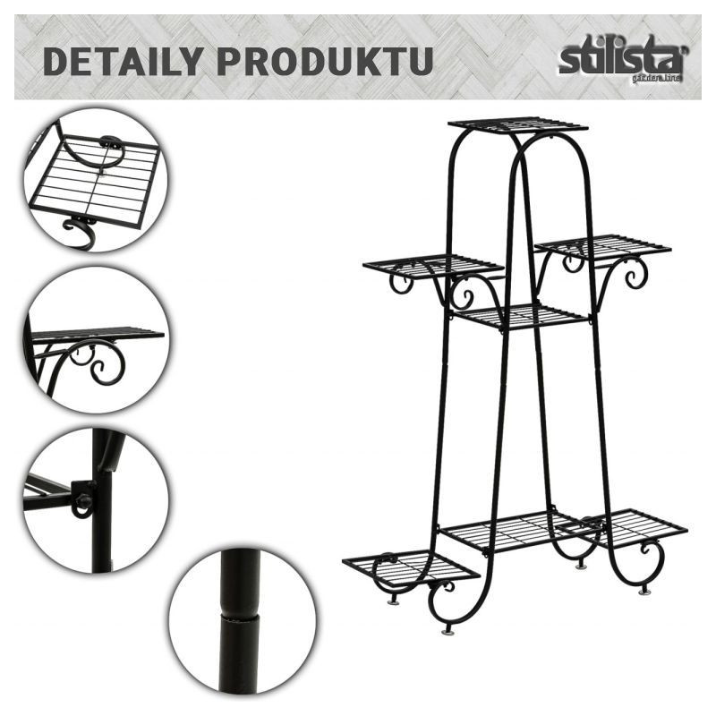 Náš stojan na kvety je vyrobený z odolného práškovo lakovaného oceľového rámu. Klasický dizajn políc sa štýlovo hodí do každého interiéru aj exteriéru. Police pre rastliny ponúkajú dostatok priestoru pre rastliny rôznych veľkostí a je možné ich použiť aj ako odkladacie police napr. pre dekoratívne prvky.