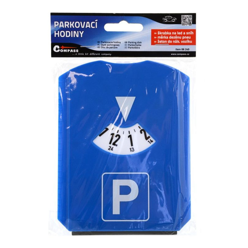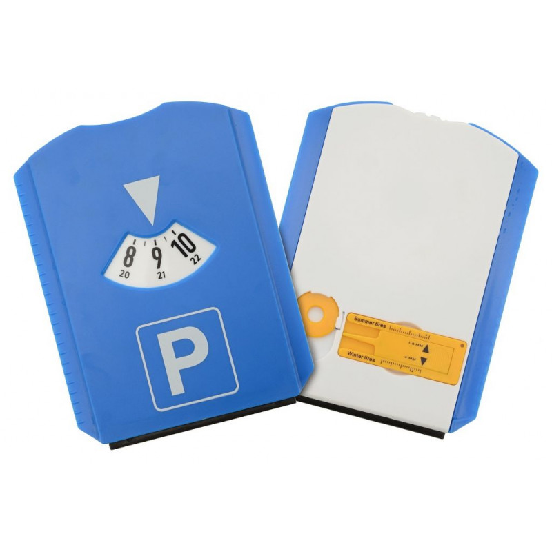 Parkovacie hodiny z odolného plastu s otočným diskom. Tri hrany parkovacích hodín sú prevedené ako čepele škrabky, ktorú je možné použiť na sneh, ľad a stranu s gumovým britom aj na vodu. Navyše sú na zadnej strane pripevnené ďalšie užitočné pomôcky. Žetón do nákupného vozíka a mierka na orientačné meranie hĺbky dezénu pneumatík. Túto multifunkčnú pomôcku tak môžete využiť skoro každý deň.
