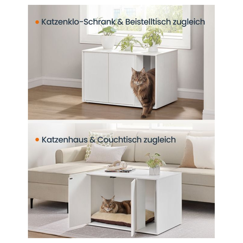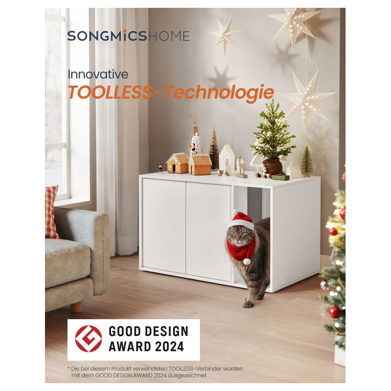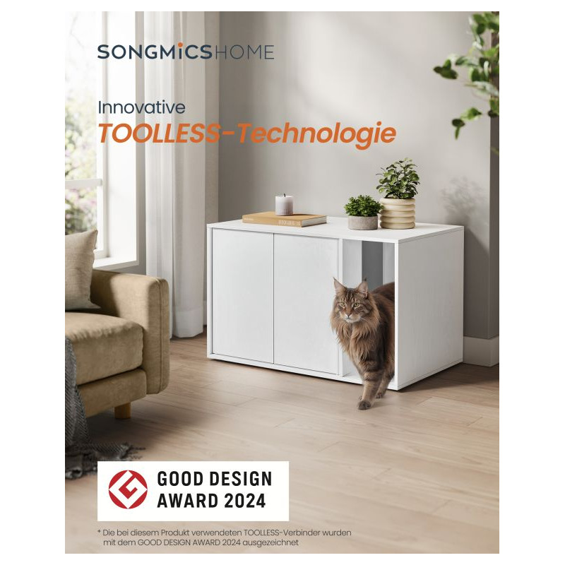 Montáž trvá len pár minút bez použitia náradia vďaka inovatívnym spojovacím prvkom. Skriňa je vyrobená z vysoko kvalitnej drevotrieskovej dosky a MDF, čo zaručuje pevnosť a odolnosť. Priestranný interiér je vhodný aj pre väčšie mačky a je ľahko čistiteľný a udržiavateľný.